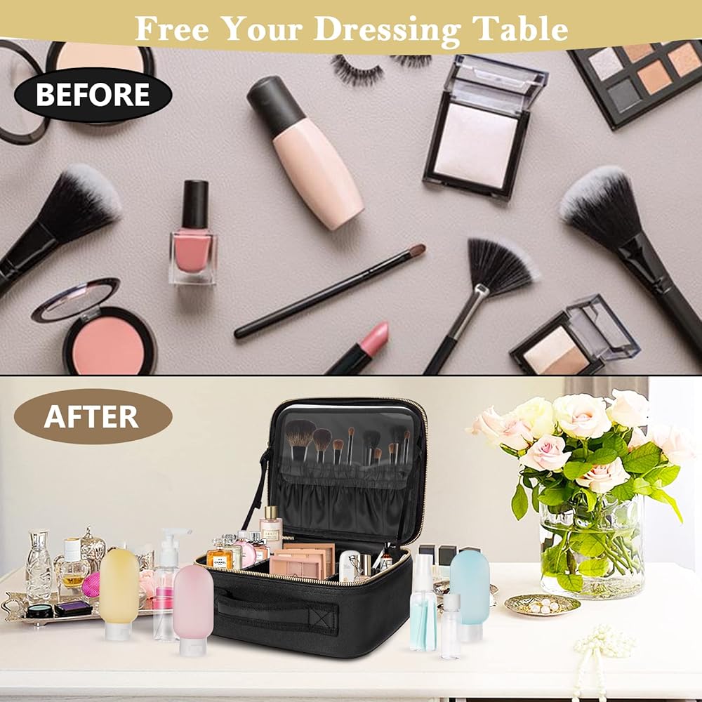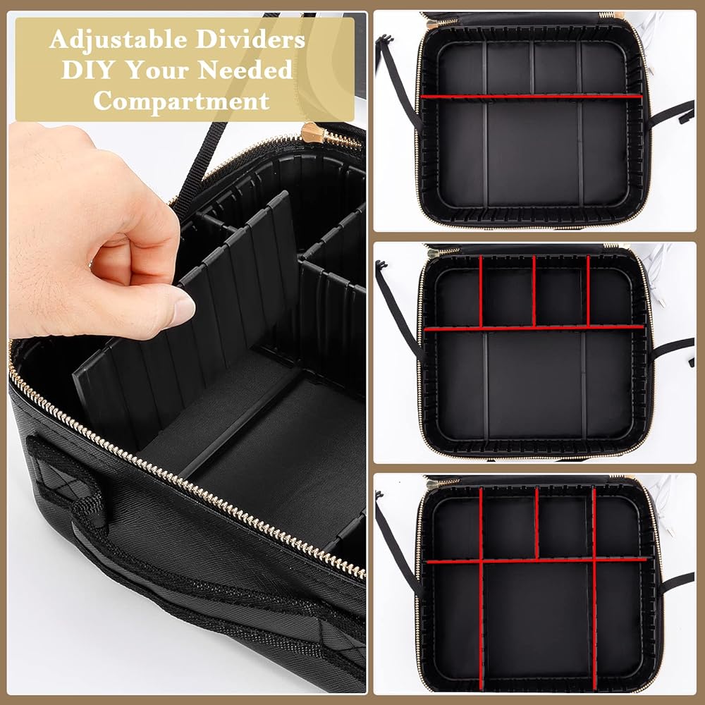 【لوحة تخزين منفصلة للفرش وأقسام قابلة للتعديل】تحتوي حقيبة مكياج السفر الخاصة بنا على 6 فواصل EVA قابلة للفصل و10 فتحات لفرش المكياج، يمكنك تصميم الأقسام الداخلية لتلبية احتياجات تخزين مستحضرات التجميل الخاصة بك، للحفاظ على مستحضرات التجميل الخاصة بك منظمة وحمايتها من الغبار.