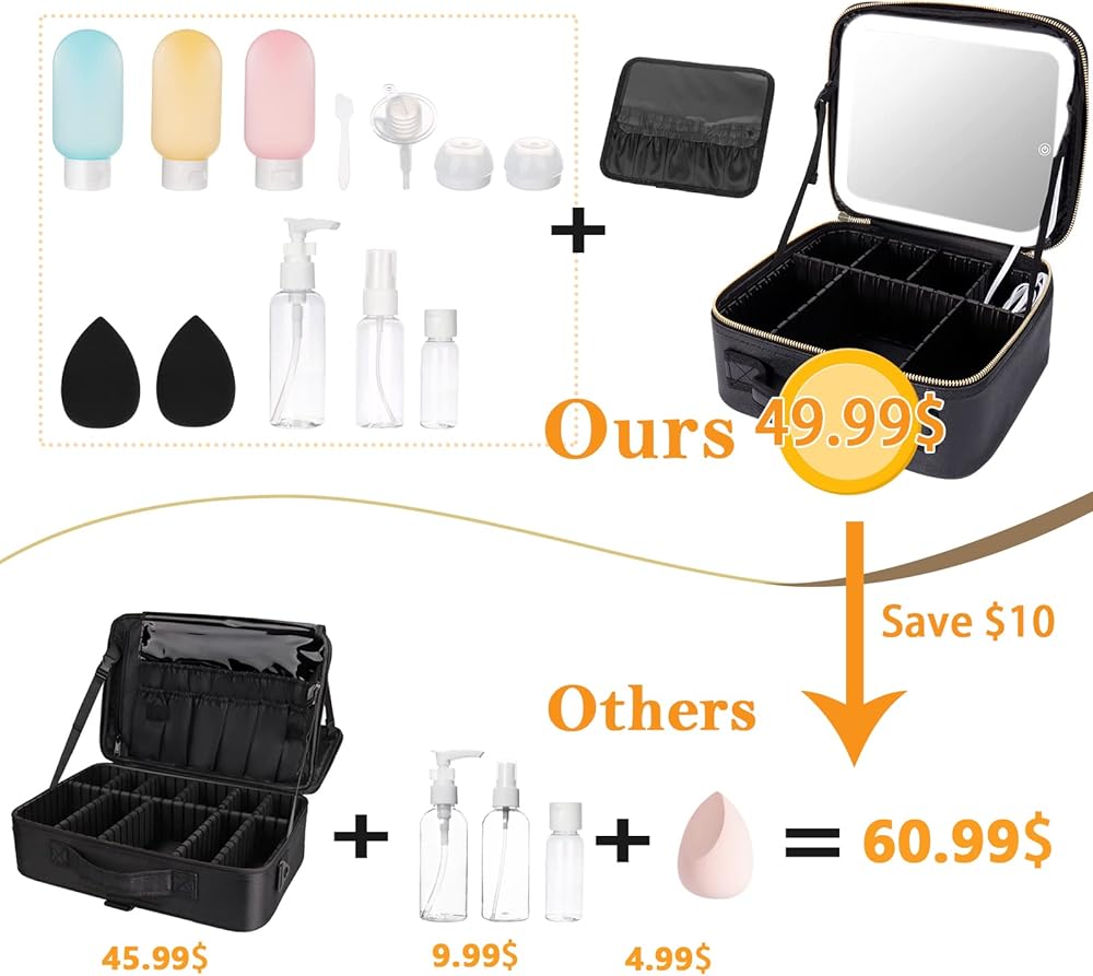 【هدية مثالية لمحبي الجمال】تشمل العبوة: حقيبة مكياج مرآة مضيئة، وفتحات لفرشاة المكياج، ومجموعة زجاجات سفر مكونة من 11 قطعة، و2*منتفخة مسحوق، والتي يمكن تعبئتها بسهولة في حقيبتك، ومريحة للحمل. يُعد منظم المكياج هذا الهدية المثالية لها، ويجب اقتناؤه لك ولعائلتك عند السفر