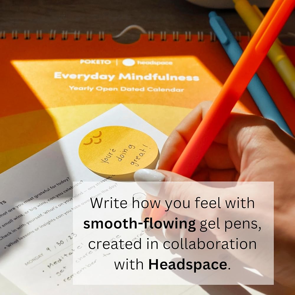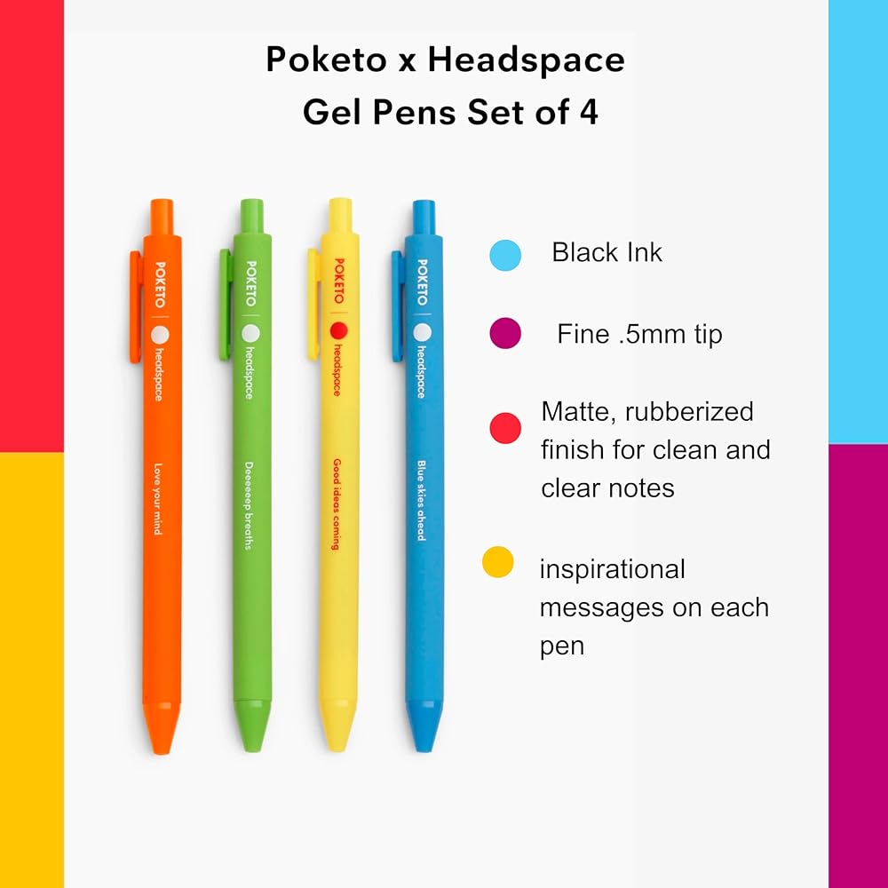 Write how you feel with smooth-flowing gel pens, created in collaboration with Headspace. Designed for a comfortable grip, each pen features an inspirational message from Headspace, so you can choose the pen that best suits your writing practice each day. The Poketo x Headspace Collection - Immerse yourself in a world of vibrant color and positivity with our new mindfulness collection—a gateway to a healthier, happier you. Like all good things, we started at art school, where founder Angie Myung created a series of artist wallets that fit right in your pocket. That series was so successful, she and her husband, Ted Vadakan, were inspired to found Poketo in 2003. We're named in honor of that amazing little wallet, and Angie's Korean grandmother's mispronunciation of the word “pocket”: Poh-keh-toe. Since then, we've grown into a creative hub, online destination, and friendly neighborhood shop in Santa Monica. We've collaborated with over 200 international artists to create exclusive products that reflect our philosophy: Art for Your Every Day. But community and fun are still at the heart of all we do. Our creations are inspired by our friends, by color, shape, and pure joy, with our founders' story at their heart. When you bring home Poketo, you bring home a playful and personal spirit that instills a sense of wonder in your everyday. We believe in the magic of small moments–and we want that for you. We make products that fuse bold intentionality with daily practicality to help you cultivate a more creative lifestyle. So whether you're planning your company's next big project, or heading out to brunch with your besties, our products give you permission to play, dream, and discover the unexpected! Come to us when you need a creative haven. A space for ideas and inklings, with no rules and no limits except your own imagination. Let your creative flag fly with Poketo!