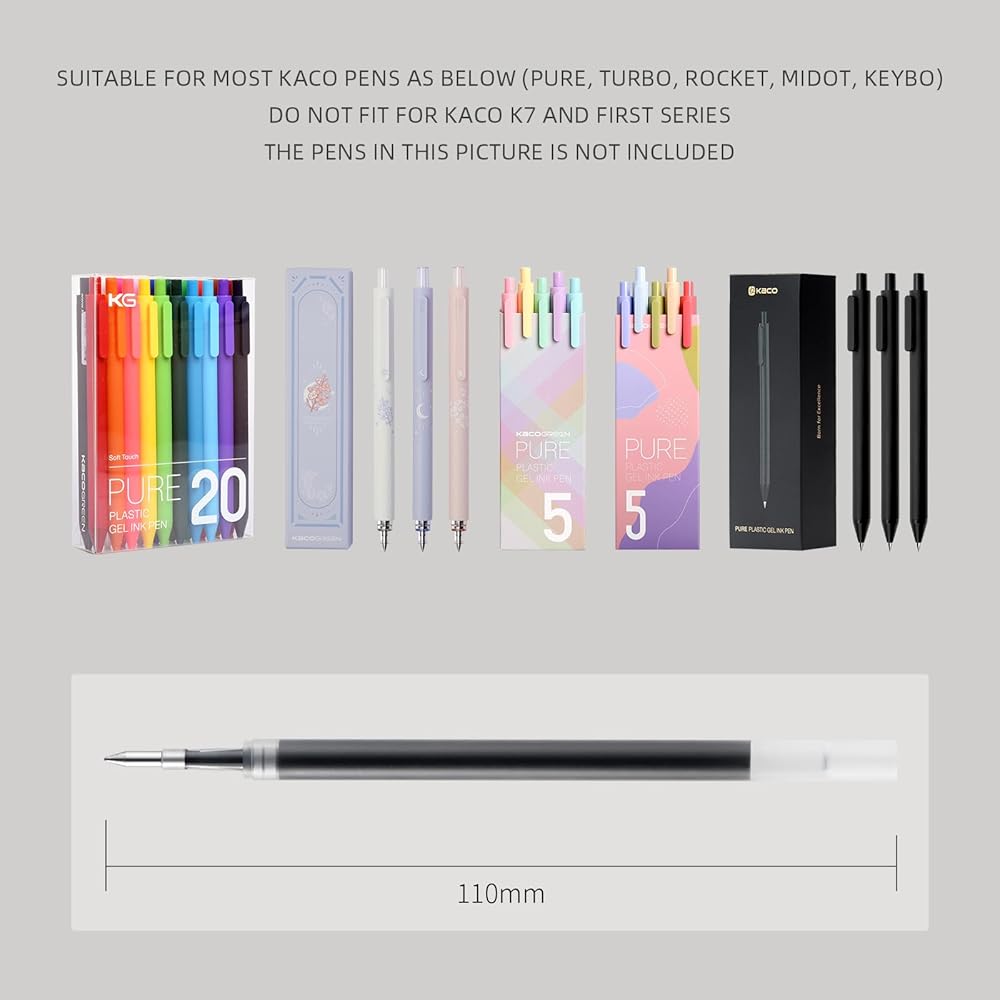 • عبوات سوداء: مناسبة لمعظم أقلام KACO (PURE، TURBO، ROCKET، MIDOT، KEYBO، K9)، لا تناسب KACO K7 والسلسلة الأولى