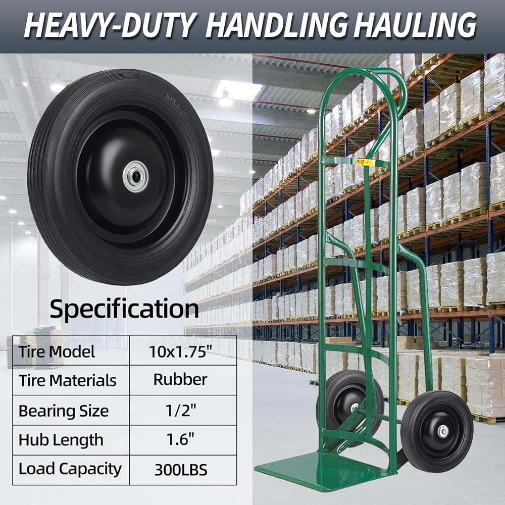 • 【HEAVY-DUTY SOLID RUBBER TIRE】 These flat-free tires are made from premium hard rubber materials have high resistance to impact cracks. Our tires are perfect for heavy-duty material handling hauling and transporting applications with a maximum load capacity of 500 pounds.