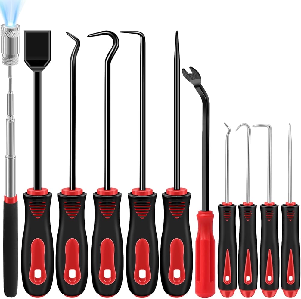 مجموعة خطاف واختيار 11 قطعة، مجموعة أدوات اختيار لختم زيت السيارة الميكانيكي/حشية خراطيم الختم الدائرية، مزيل سحب مع مكشطة ومجموعة أدوات تلسكوبية مغناطيسية، أسود وأحمر