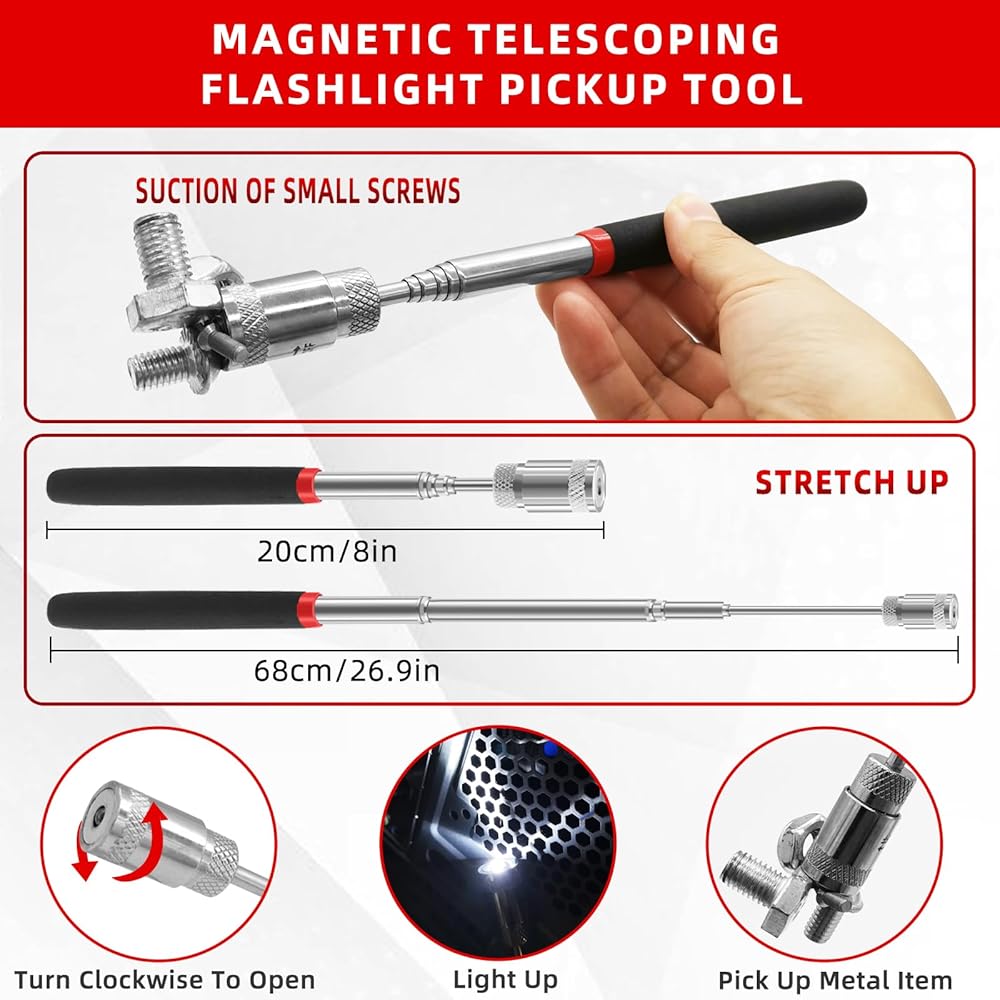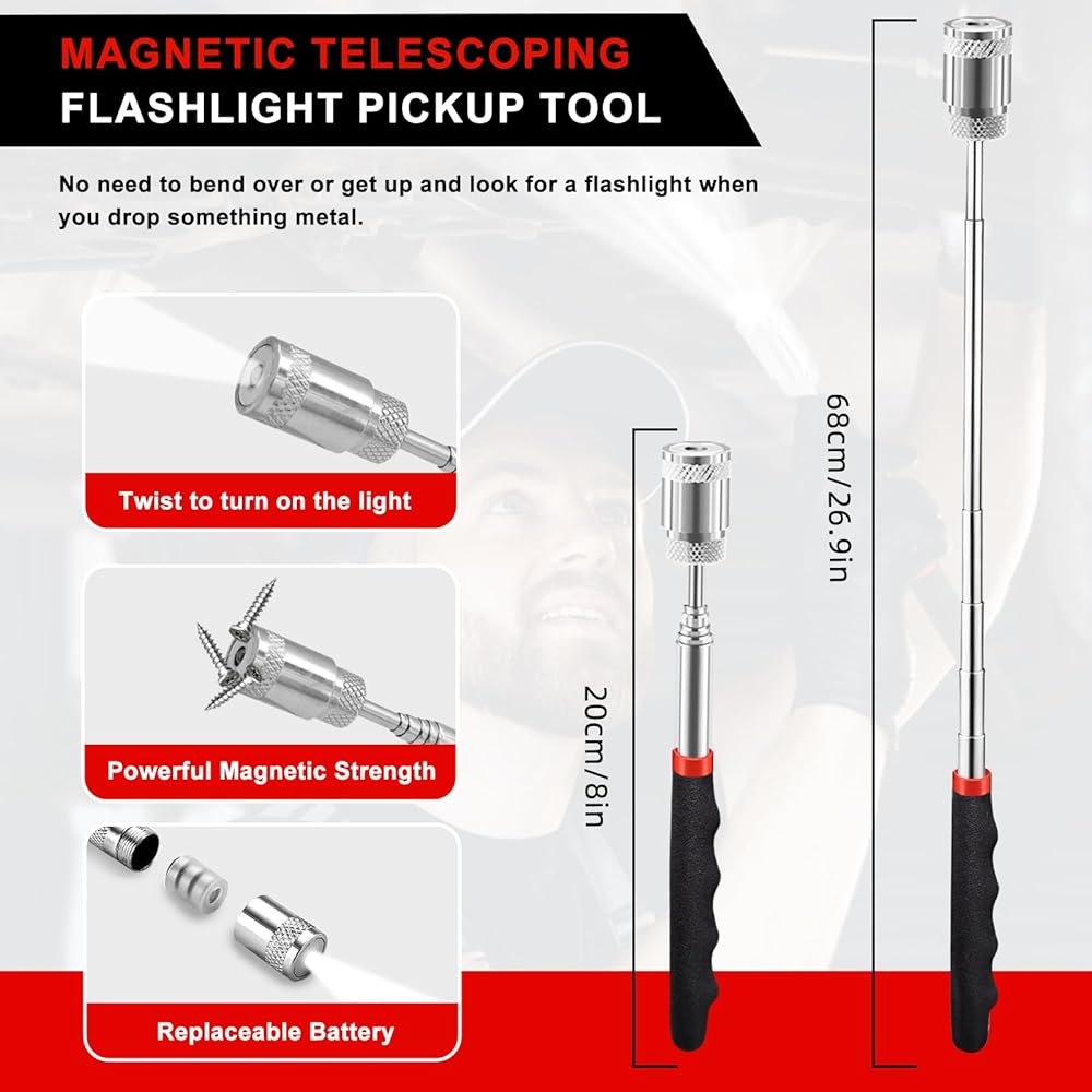 أداة اختيار مصباح يدوي تلسكوبي بإضاءة LED: الأداة المغناطيسية التلسكوبية بطول قابل للتعديل حتى 27 بوصة، مما يساعد على الإمساك بالأشياء في أماكن بعيدة للوصول لاستعادة البراغي أو الأظافر أو لقم الثقب أو أدوات التثبيت أو غيرها من الأشياء المعدنية المفقودة. لا داعي للانحناء أو النهوض والبحث عن مصباح يدوي عندما تسقط شيئًا معدنيًا.