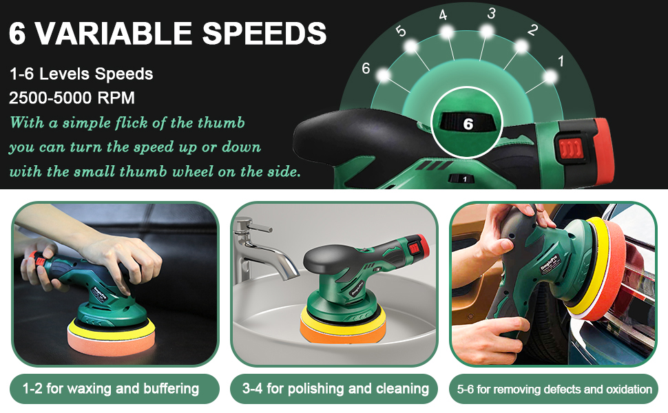 【6 سرعات قابلة للتعديل، حتى 5000 دورة في الدقيقة】يحتوي الجزء الداخلي من جهاز التلميع اللاسلكي لتفاصيل السيارة على محرك قوي، ويمكن تعديل السرعة في 1-6 مستويات، حتى 2500-5000 دورة في الدقيقة. الطاقة كافية، يمكنها القيام بتلميع السيارة/إزالة الشعر بالشمع/التخزين المؤقت بشكل جيد، وتحديث سيارتك.
