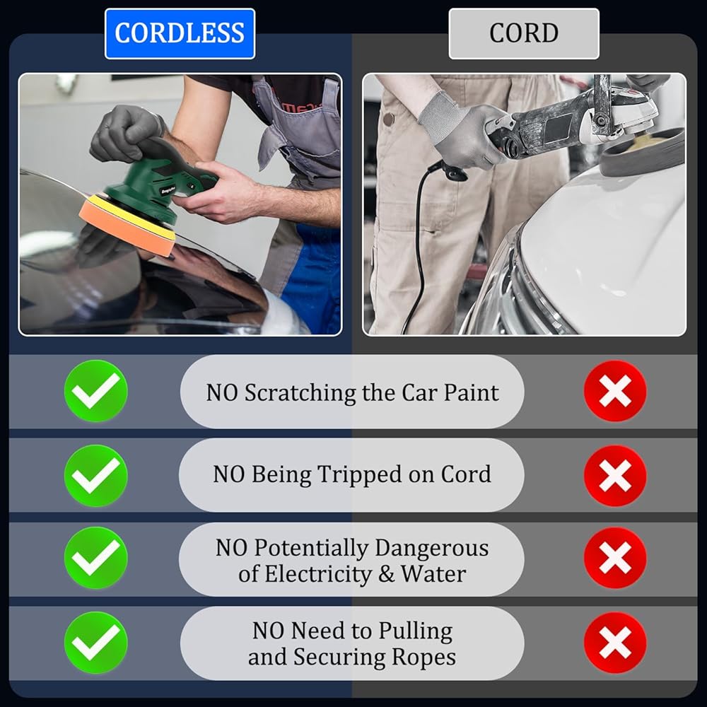 【لاسلكي، عمل أسهل】يتم تشغيل ملمع السيارة اللاسلكي هذا ببطارية ليثيوم، مما يمنع مسألة احتكاك الحبل بالسيارة، أو التعثر بالسلك، أو خطر الاختلاط بالكهرباء والماء. كما أنه لا يحتاج إلى توصيله بمقبس للاستخدام، ويكون التشغيل أكثر أمانًا.
