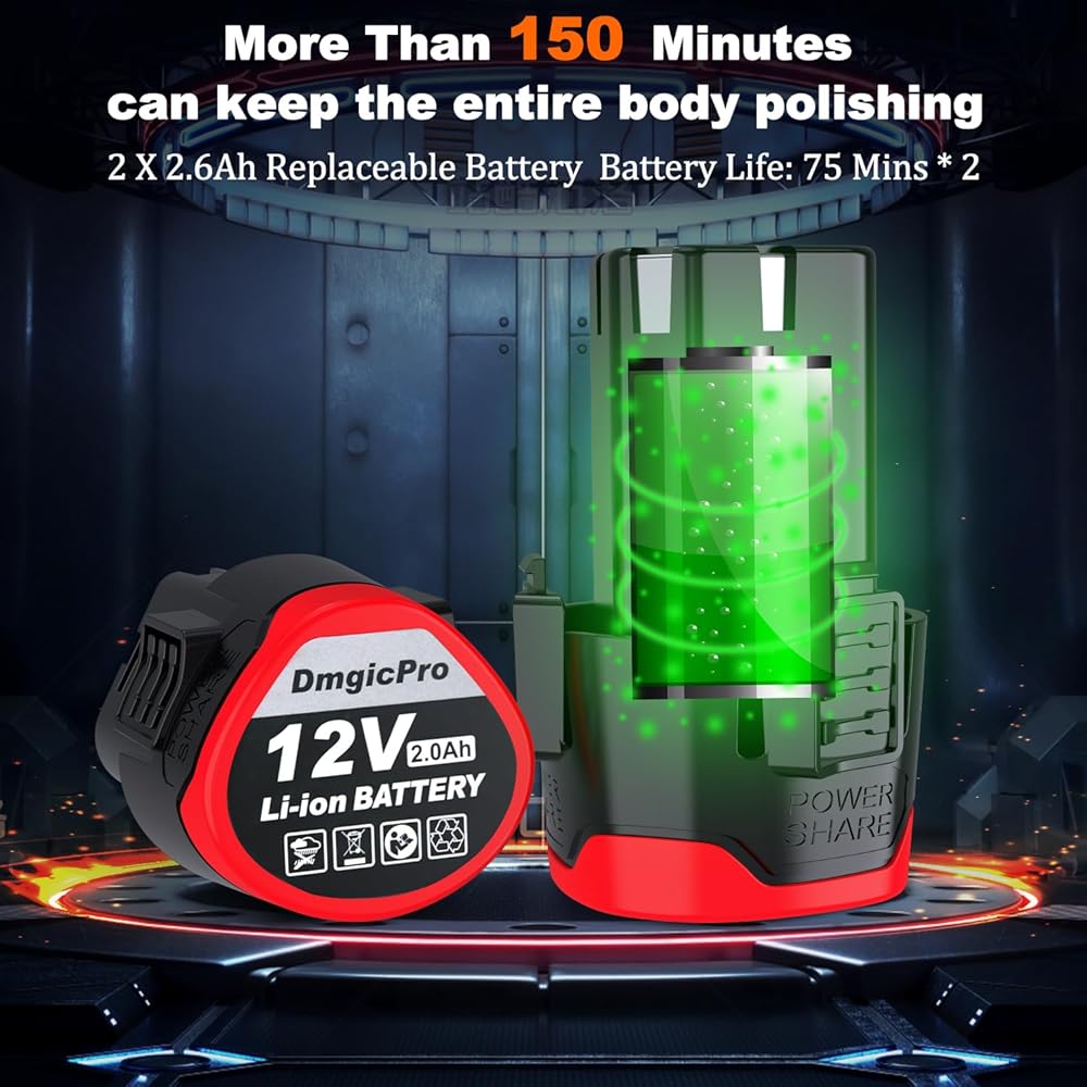 【بطارية مطورة بقدرة 2600 مللي أمبير في الساعة 】- تتم ترقية سعة كل بطارية إلى 2600 مللي أمبير في الساعة، بالمقارنة مع بطارية 2000 مللي أمبير في الساعة، يمكن زيادة ساعات العمل لمدة 1.5-2 ساعة، كفاءة عالية ومتينة، الحل الأمثل لعمل التلميع لفترة طويلة.