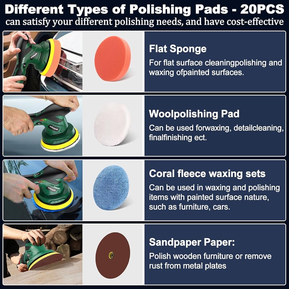【سريع التنظيف، سهل التركيب】 يتميز جهاز تلميع السيارة اللاسلكي بقرص تلميع فيلكرو مقاس 6 بوصات (14.5 سم)، ويوفر منطقة اتصال مثالية للتنظيف السريع وتوفير الوقت. مزود بـ 20 قطعة من الملحقات، وشريط مطاطي وتصميم فيلكرو، وسهل التشغيل .