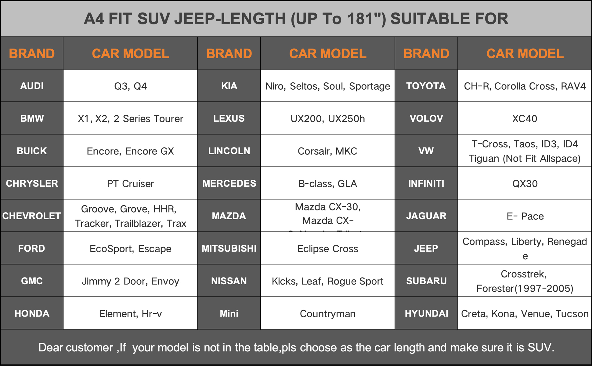 【الأبعاد A4】- تناسب عالمي سيارات الدفع الرباعي التي يصل طولها إلى 181 بوصة (ليست لسيارة السيدان وهاتشباك). مناسب لأودي q3، BMW X1، هوندا hrv، هيونداي توكسون/كونا، XC40، بويك إنكور، جيب كومباس/ليبرتي/رينيجيد، كيا سول/سبورتاج، سوبارو فورستر/xv إلخ.