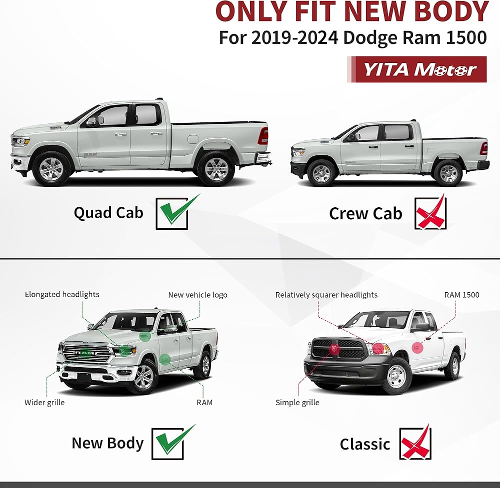 هام - تتوافق هذه الخطوة الجانبية للوحة التشغيل مع سيارة دودج رام 1500 رباعية الكابينة 2019-2024 مع بابين أماميين بالحجم الكامل وبابين خلفيين أضيق طراز هيكل جديد (باستثناء 2019-2023 Classic) (ليس لطاقم الكابينة أو الكابينة الضخمة)