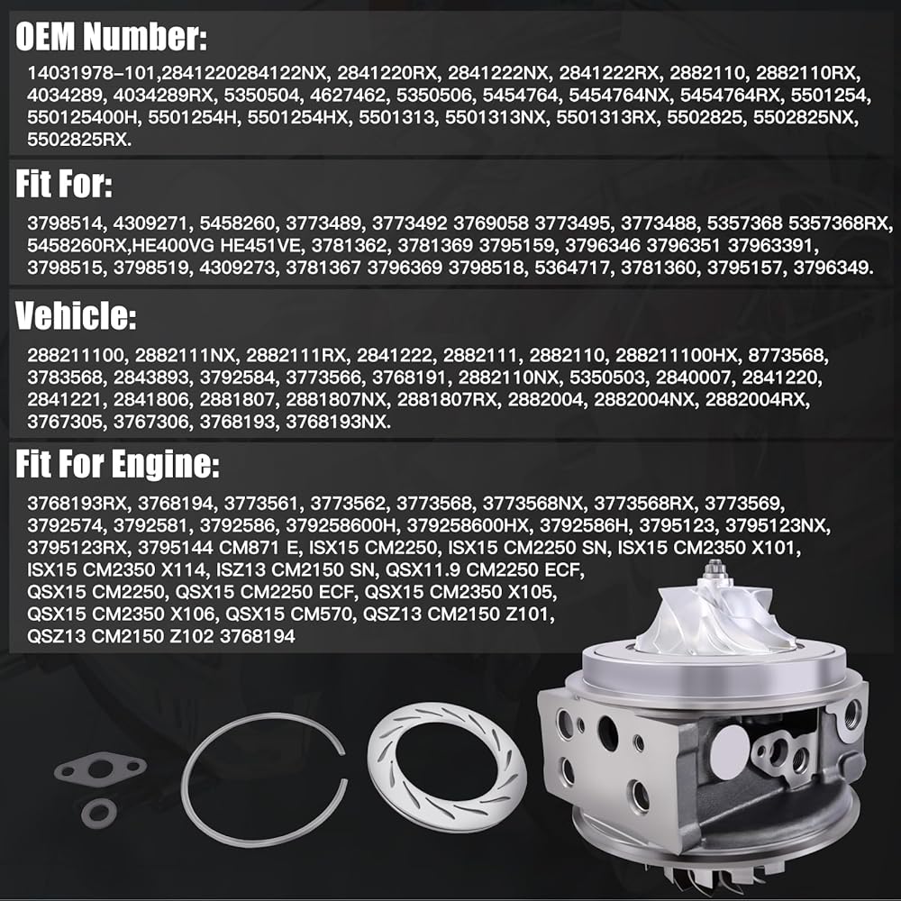الوظيفة- تعد خرطوشة التوربو هذه بديلاً موثوقًا للجزء الأصلي الخاص بك. عندما يتعطل الشاحن التوربيني، فإن الاستجابة الأكثر شيوعًا هي استبدال الوحدة بأكملها. ومع ذلك، غالبًا ما يحدث الضرر داخل صندوق التوربو، الذي يحتوي على المكونات الرئيسية لمجموعة التوربو.
