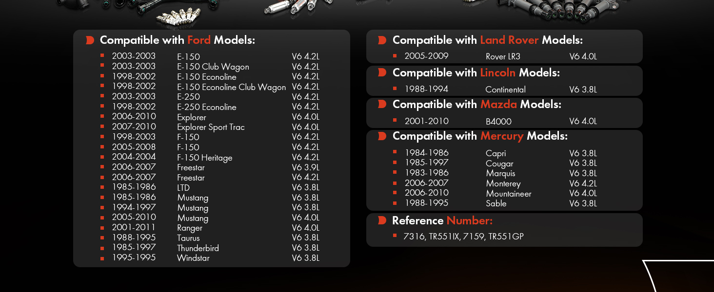 [تركيب السيارة-1]: متوافق مع Ford E-150 4.2L، E-150 Club Wagon 4.2L، E-150/E-250 Econoline 4.2L، E-150 Econoline Club Wagon 4.2L، E-250 4.2L، Explorer 06-10 4.0L، Explorer Sport Trac 2007-2010 4.0L، متوافق مع F-150 1998-2003/2005-2008 4.2L، متوافق مع F-150 Heritage 2004 4.2L، Freestar 2006-2007 3.9L/4.2L ، LTD 1985-1986 3.8L، متوافق مع موستانج 1985-1986/1994-1997 3.8L، متوافق مع موستانج 2005-2010 4.0L، رينجر 2002-2011 4.0L، رينجر 2001 4.0L، توروس 1988-1995 3.8L