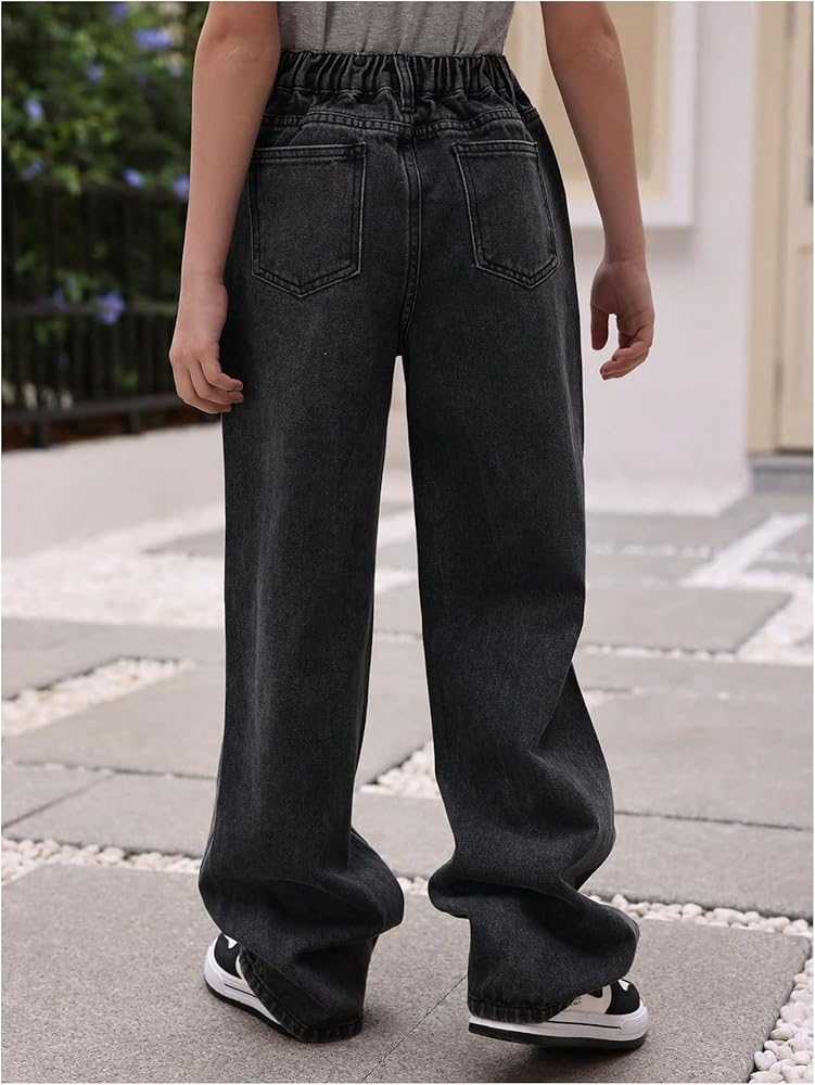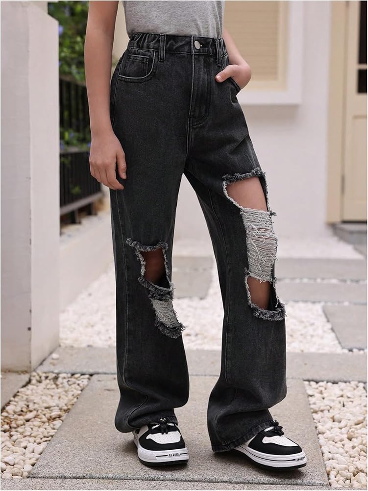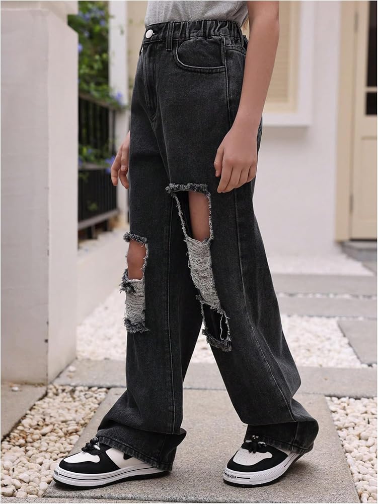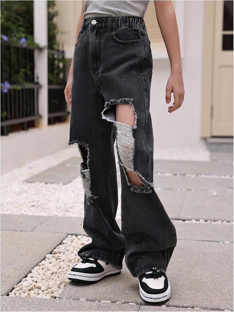 بنطال جينز Verdusa للفتيات كاجوال ممزق بخصر مطاطي وساق واسعة من قماش الدنيم