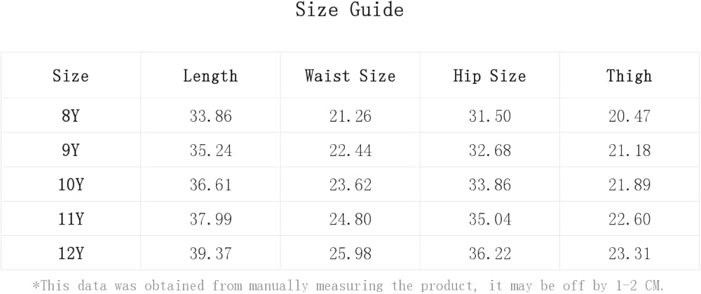 12-13Y: Hip Size: 34.6", Length: 38.6", Thigh: 22.2", Waist Size: 23.6-34.6"