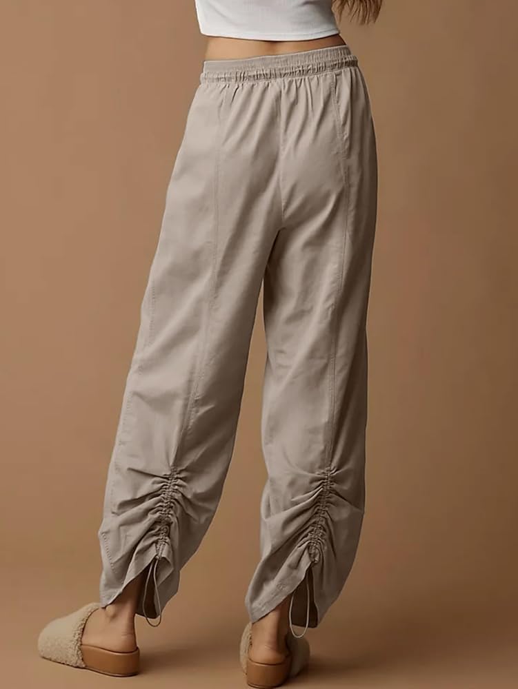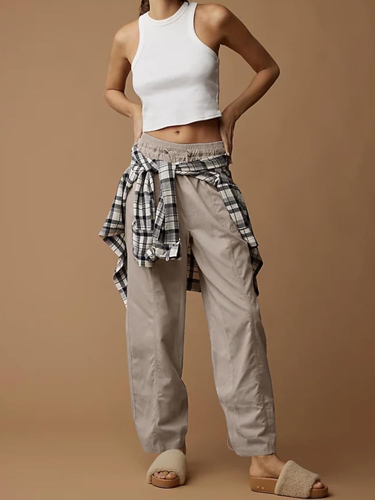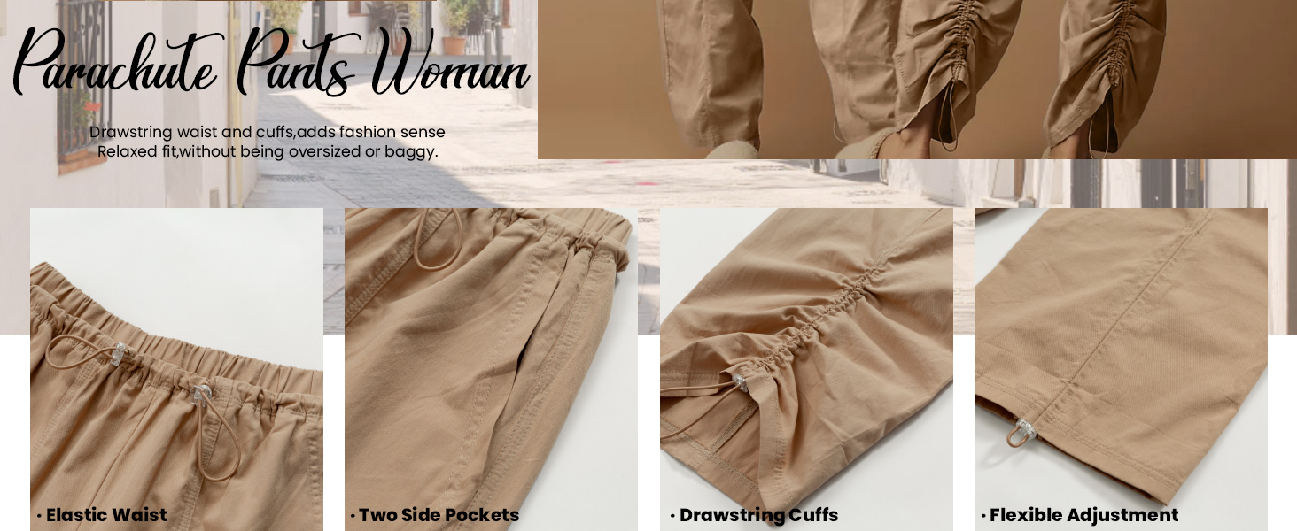 القماش: سراويل باراشوت رياضية مصنوعة من القطن بنسبة 100%، صديقة للبشرة، ناعمة، مريحة، وخفيفة الوزن، اختيار رائع للملابس لأي موسم. يُغسل يدويًا أو في الغسالة بماء بارد، لا تستخدم المبيضات، ويُقترح تعليقه ليجف.