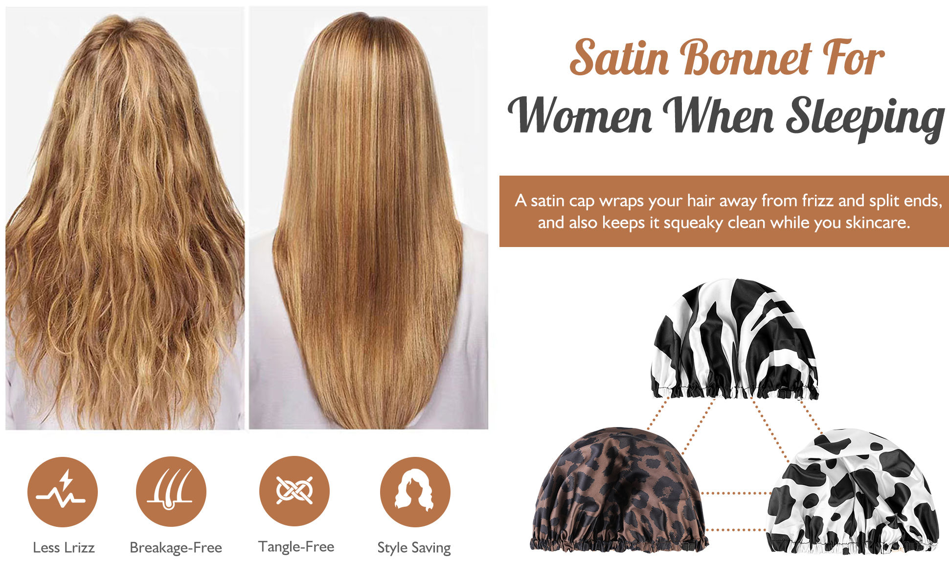 فوائد بونيه الساتان: يمكن لغطاء الساتان الحريري الناعم أن يعزل الاحتكاك بين شعرك والوسائد لتقليل الضرر، والحفاظ على الرطوبة، وتخفيف التجعد، وتقليل الكهرباء الساكنة، وجعل الشعر أكثر ليونة وإشراقًا. حافظي على تسريحة شعرك طوال الليل حتى تستيقظي في اليوم التالي مع الحاجة إلى تصفيف سريع فقط؛