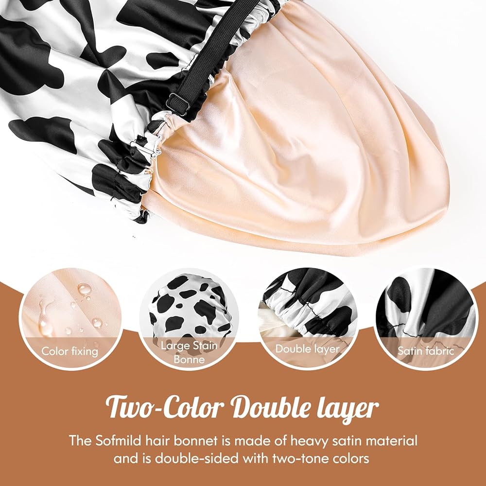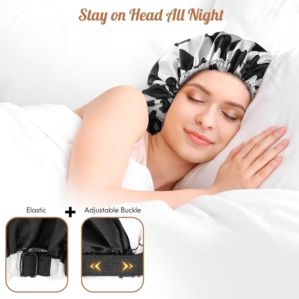 مواد ناعمة وعالية الجودة: القلنسوة الخاصة بنا مصنوعة من الساتان الناعم والحريري الناعم والمسامي والملمس الجيد على الرأس. تتميز هذه المادة المقاومة للتجاعيد والخدش بطبقتين يمكن تبديلهما على كلا الجانبين. كما أنها لن تبهت أو تلطخ فراشك؛