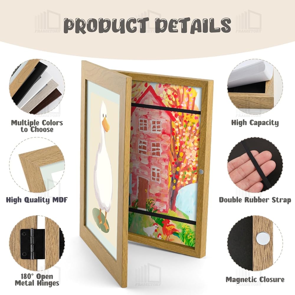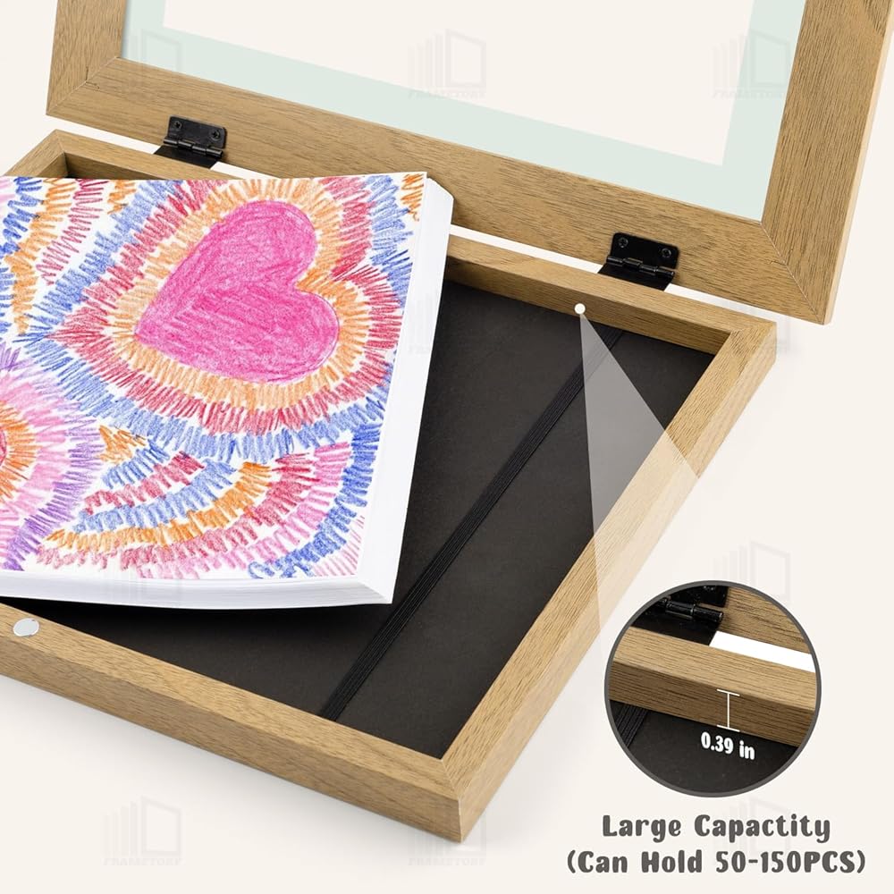 • 【سعة عالية】مناسبة تمامًا للأعمال الفنية مقاس 8.5x11 بوصة أو أصغر، ويبلغ عمقها 0.39 بوصة، مما يجعلها قادرة على حمل 50-100 قطعة من الأعمال الفنية للأطفال. يمكنك بسهولة عرض وتغيير الأعمال الفنية لطفلك في مكان واحد، دون الحاجة إلى ذلك. القلق بشأن الفوضى أو نفاد المساحة.