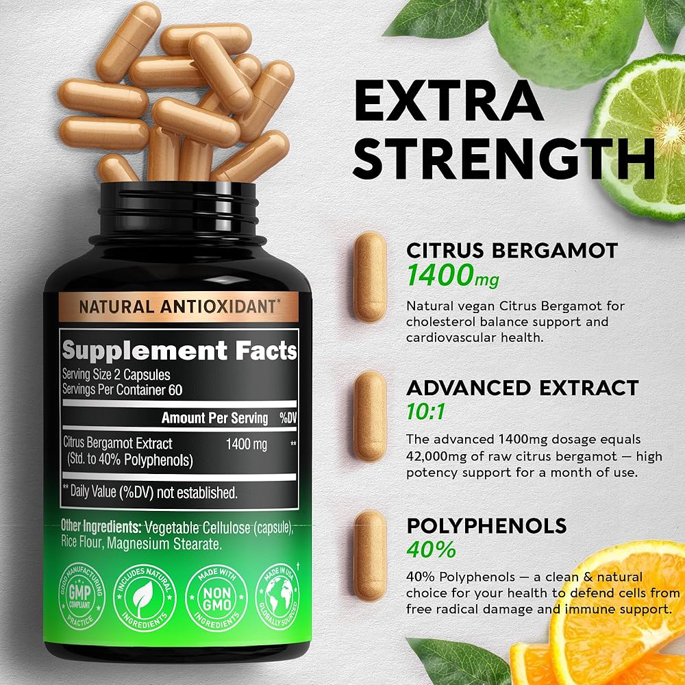 الحمضيات والبرغموت 1400 مجم - شحنة حمضيات حقيقية من العافية! مكمل نباتي طبيعي من الحمضيات والبرغموت لدعم صحة القلب. مكملات الحمضيات والبرغموت هي مكمل طبيعي يحتوي على مركبات مضادة للأكسدة ذات نشاط مضاد للأكسدة عالي.