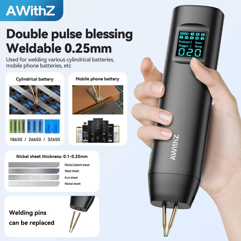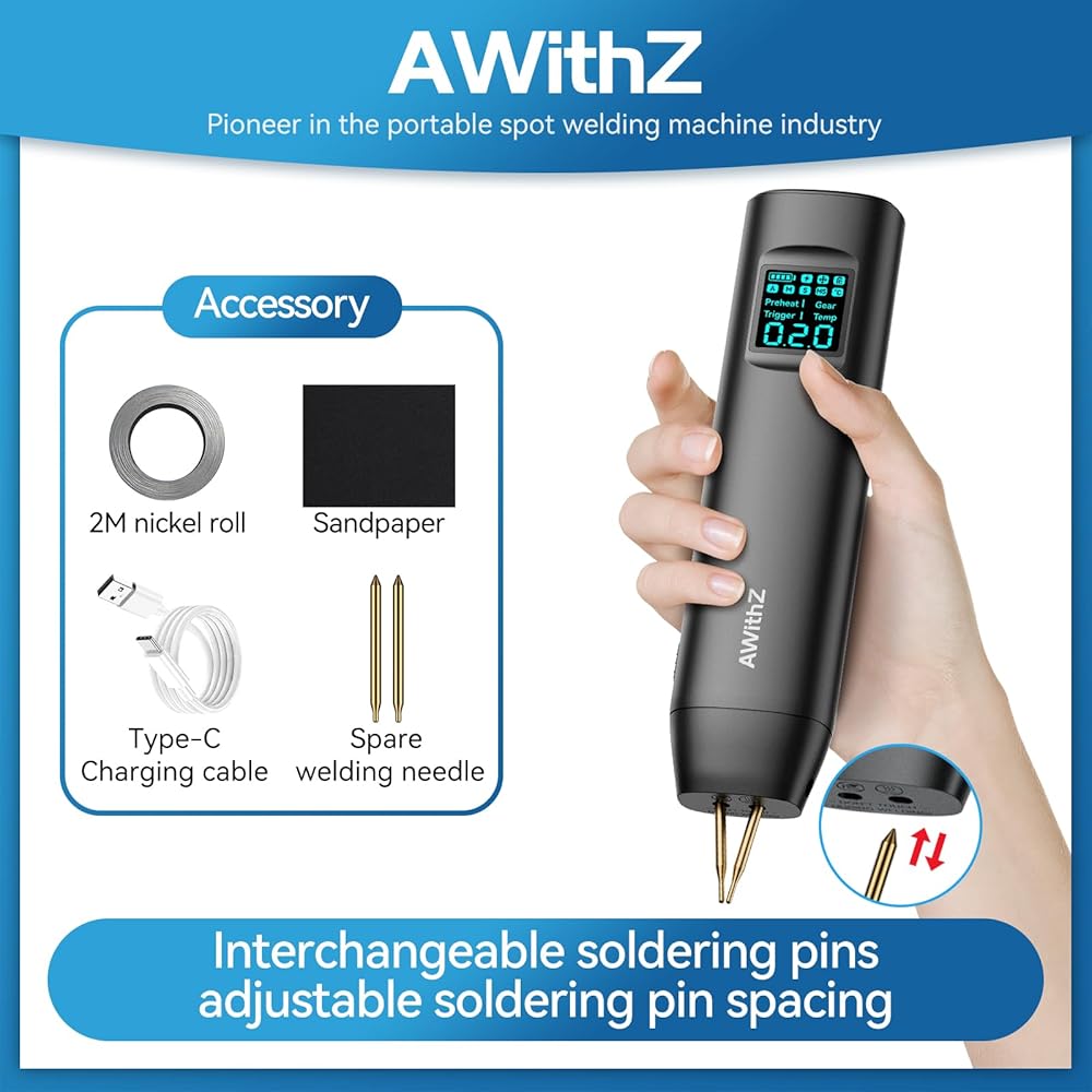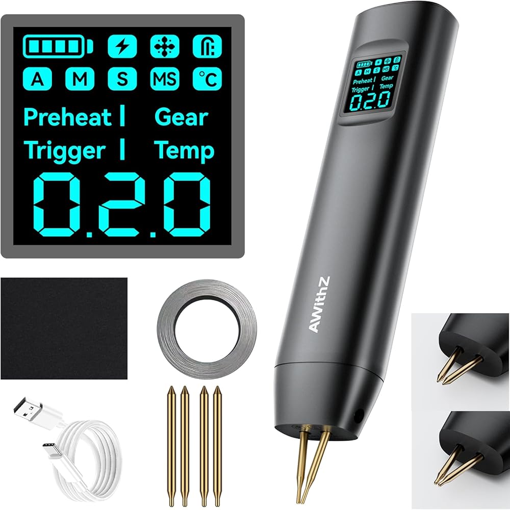 لا يوجد قلم لحام نقطي------لا حاجة لقلم لحام نقطي عند الخروج أو في المنزل، ماكينة لحام نقطية محمولة لا تتطلب أقلام لحام نقطية إضافية، احملها معك وهي مريحة للذهاب إلى أي مكان. فهو يجمع بين مصدر الطاقة المدمج وقلم اللحام في جهاز واحد، مما يجعل من السهل اللحام دون الحاجة إلى قلم لحام خارجي.