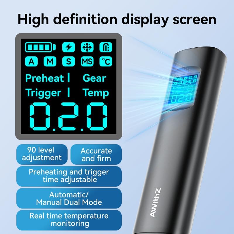 سهل الاستخدام - زرين فقط، أزرار لحام البقع الخاصة بنا مُلصقة، سهلة الاستخدام. لا يحتاج لحام بقعة البطارية إلى ترك راحة يدنا. اضغط مع الاستمرار على زر مفتاح الطاقة الموجود على الجانب لمدة ثانيتين بإصبعك الأوسط، واضغط على زر تعديل الترس في الأعلى بإصبع السبابة مرة واحدة، واضغط مع الاستمرار لمدة ثانيتين لضبط الوضع التلقائي أو اليدوي.
