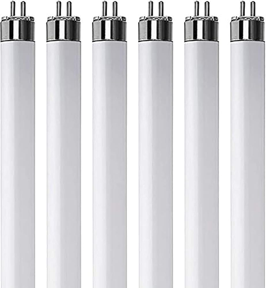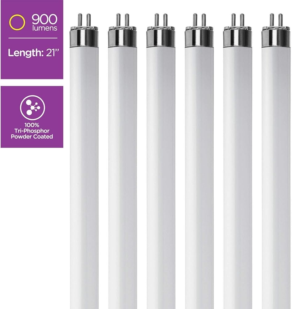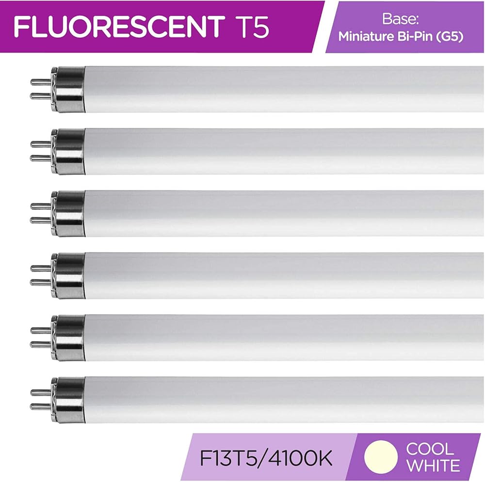 • مواصفات اللمبة: هذه الحزمة المكونة من 6 مصابيح فلورسنت F13T5/CW يبلغ طولها 21 بوصة (من نهاية الدبابيس إلى نهاية الدبابيس) وتستخدم 13 واط و900 لومن.
