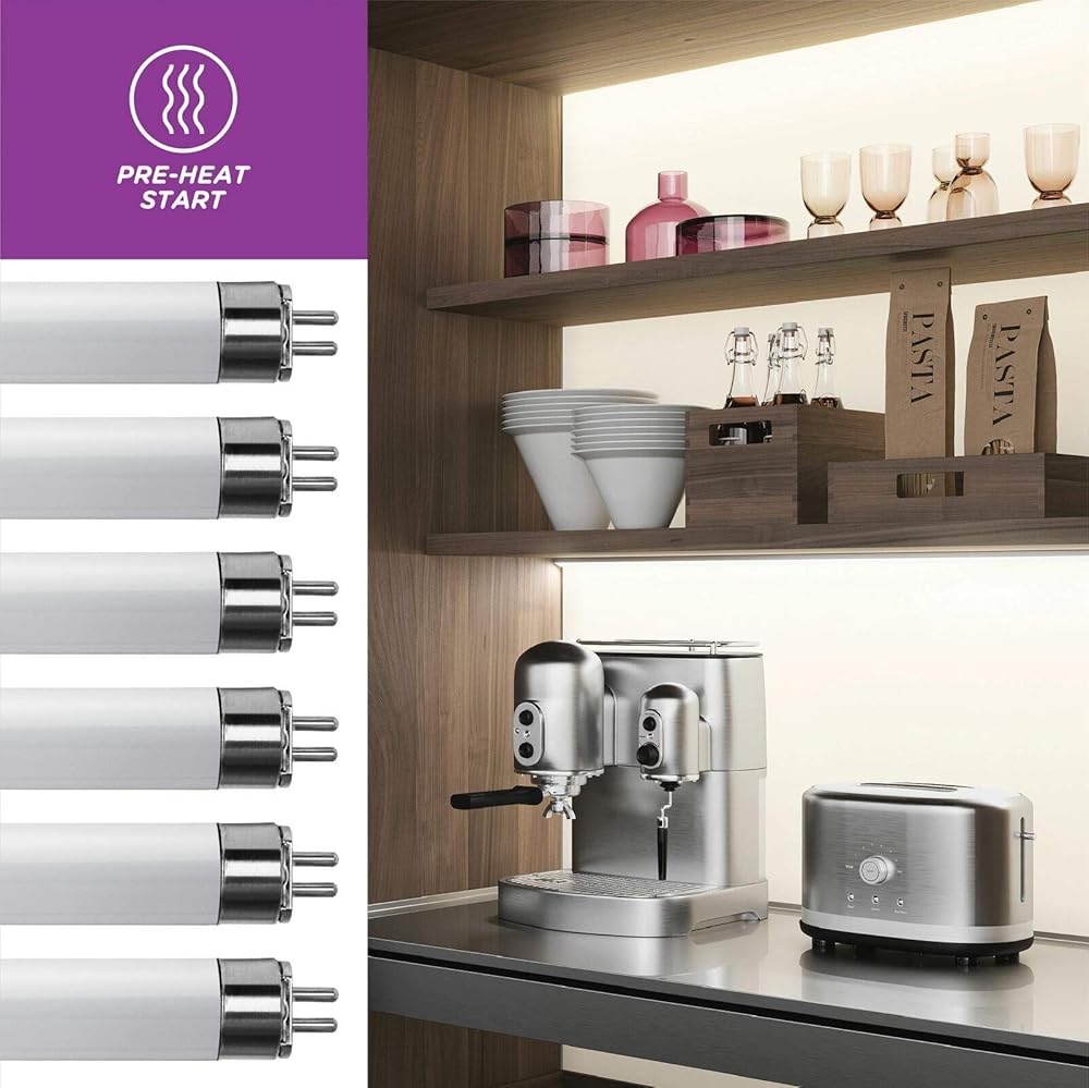 • التطبيقات: تُستخدم أنابيب الفلورسنت T5 هذه بشكل شائع في الأضواء الموجودة أسفل الخزانة أو تحت المنضدة في مطبخك وفي عربة سكن متنقلة بالإضافة إلى العديد من التطبيقات الأخرى.
