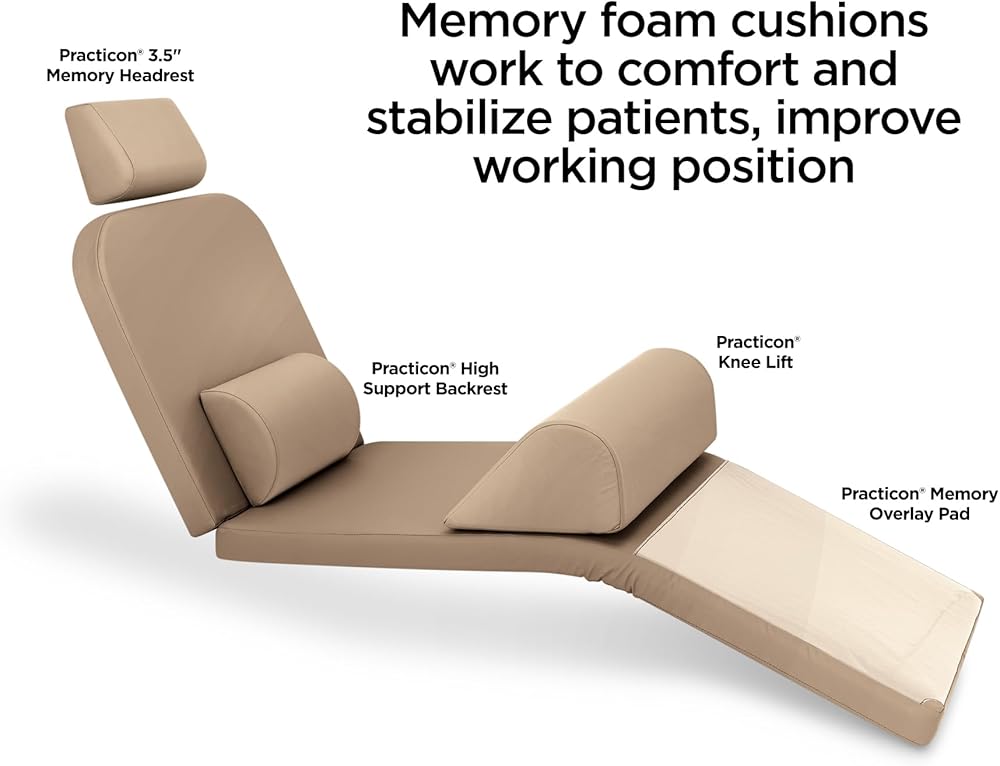 Practicon Memory Cushion Supports are US-made with superior features. Includes 20% higher density foam for longer wear and better patient stability. Thicker elastic straps with adjustable buckles for lasting tightness. Full-zippered back closures for better fitting fabric. Their soft urethane fabric covering ensures patient comfort and easy surface cleaning. Non-slip backing. Practicon High-Support Backrest adds extra lumbar support for patients during lengthy procedures. 3-1/2"H x 11"W x 7-1/2"D.