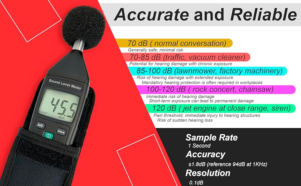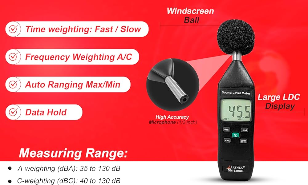 • دقيق وموثوق: ميكروفون مكثف إلكتريت 1/2 بوصة، الدقة ±1.8 ديسيبل (المرجع 94 ديسيبل عند 1 كيلو هرتز) ودقة 0.1 ديسيبل
