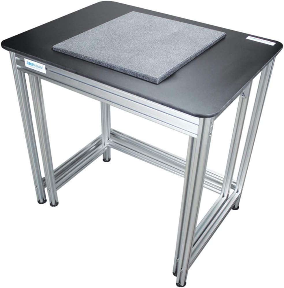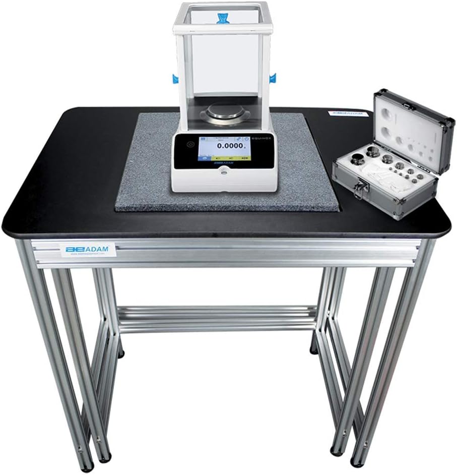 The Adam Equipment anti-vibration table for precision and analytical balances and scales provides a stable weighing environment, reducing the shock and vibration that can affect the accuracy of readings from sensitive machines. The table consists of two parts: an internal work surface with a scratch-resistant, polished marble slab mounted on an adjustable rubber base to absorb shock and vibration; and an outer table topped with epoxy-resin, that provides additional workspace. The frame is lightweight aluminum, and has adjustable feet that ensure level measurements and stability for weighing. The Adam Equipment anti-vibration table for precision and analytical balances and scales provides a stable weighing environment that increases the accuracy of sensitive balances and scales.