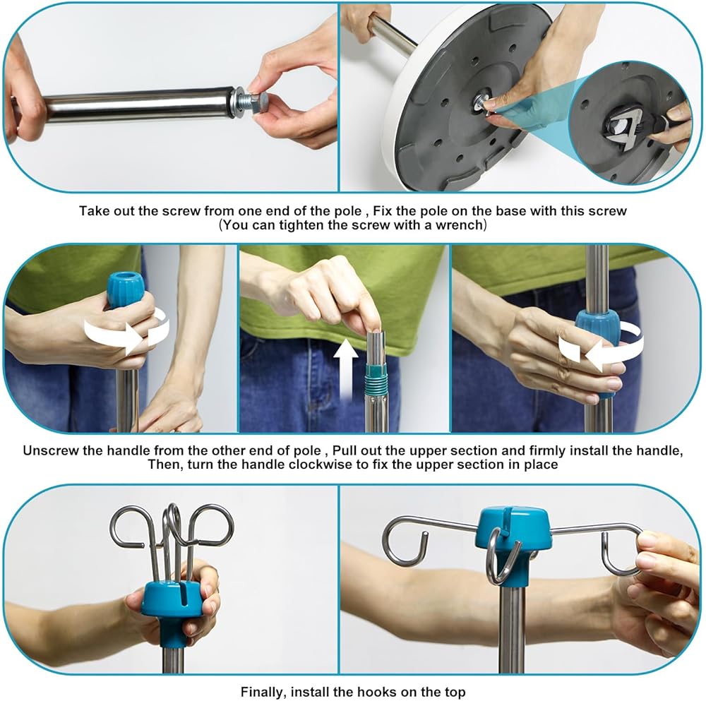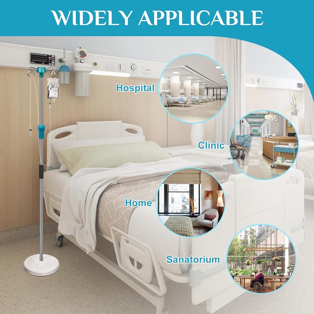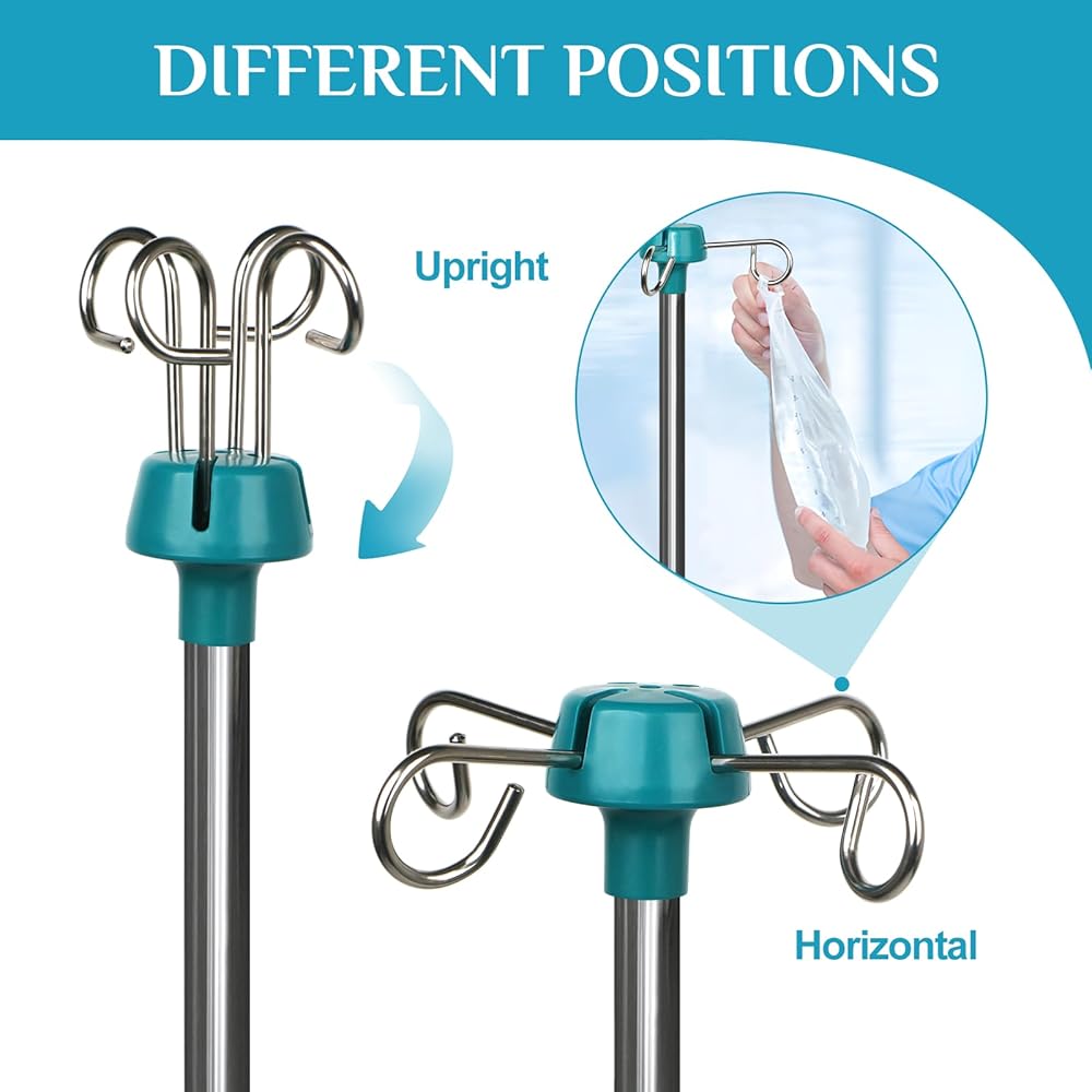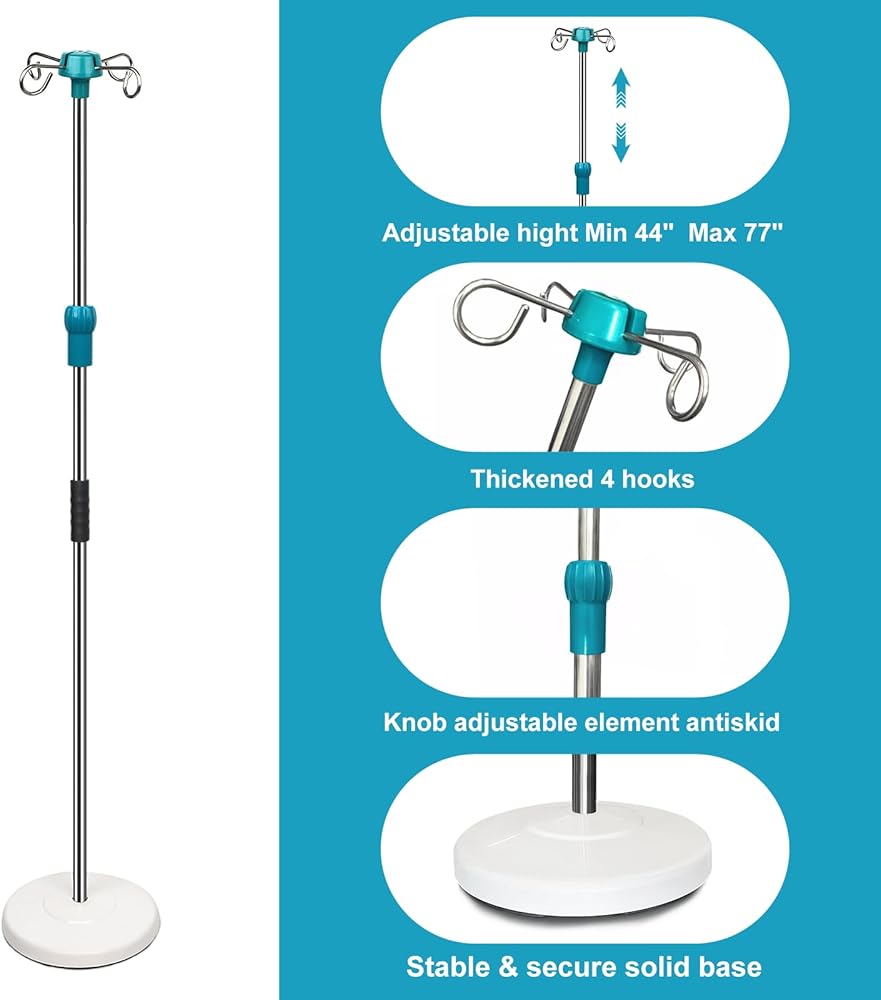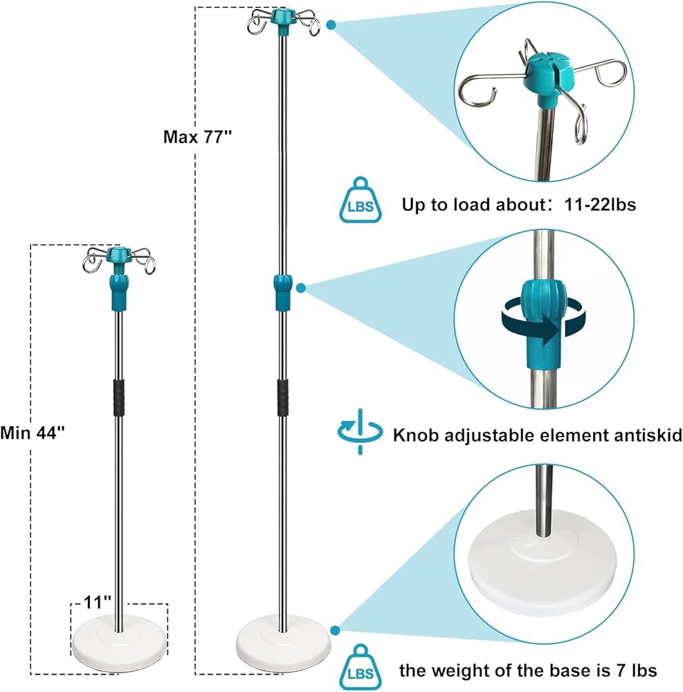 حامل عمود IV بقاعدة صلبة شديدة التحمل مع 4 خطافات، ارتفاع قابل للتعديل 44 بوصة إلى 77 بوصة حامل قطب طبي محمول، حامل حقيبة IV مع حامل حقيبة IV قابل للإزالة، عمود علوي قابل للإزالة للمنزل والمستشفى والعيادة