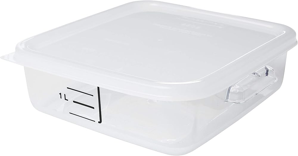 The Rubbermaid Commercial Space Saving Food Storage Container keeps food fresh, organized, and ready-to-use. Featuring easy-to-read graduated measurements in blue for liters and red for quarts, these plastic food storage containers make it easy to measure contents. Because we believe the best food storage containers use space efficiently, we've designed these plastic containers with a square shape that offers 25% more storage capacity than round containers. Constructed of break-resistant polycarbonate, they have a temperature range of -40°-212°F making them perfect for everything from freezer storage to sous vide cooking. Commercial dishwasher safe, they feature durable handles with drain holes for proper washing and drying. USDA-certified for food contact, it assists in complying with HACCP guidelines and is NSF 3-A Meat and Poultry Equipment and NSF 2-certified.