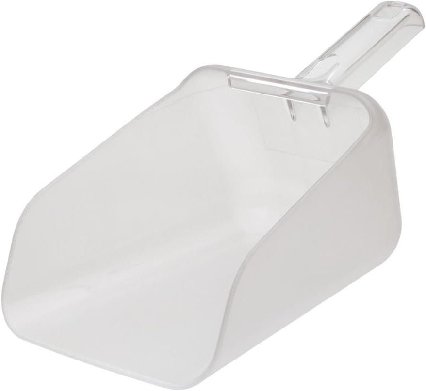 Rubbermaid Commercial FG9F7600CLR Bouncer Contour Scoop for Ingredient Bins, 64-Ounce, Clear. Is designed for even weight distribution and is for commercial, medical, and industrial use. Its polycarbonate construction is durable, won't break, and resists oil and grease. Is designed for even weight distribution and is for commercial, medical, and industrial use. It has a smooth surface to make cleaning easier. Capacity: 64-ounce. It is dishwasher safe. It fits Rubbermaid ingredient bins 3600-88, 3602-88, and 3603-88. Made in the USA