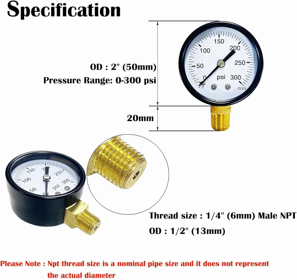 The circular dial has a diameter of 2 inches (50mm), and the brass wetted parts at the bottom is 20mm long and measures 1/4 inch (6mm) npt.