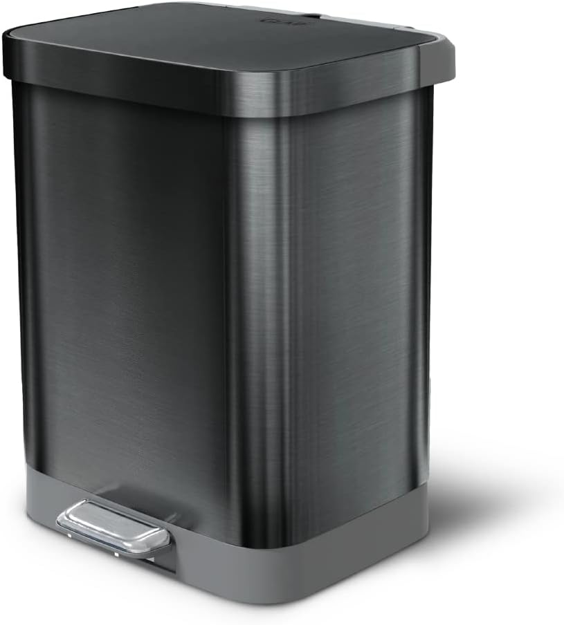 سلة مهملات من الفولاذ المقاوم للصدأ من جلاد مع حماية من رائحة الكلوروكس | سلة قمامة معدنية كبيرة للمطبخ مع غطاء ناعم ودواسة قدم وحامل لفافة أكياس النفايات، سعة 13 جالونًا، جميعها من البيوتر