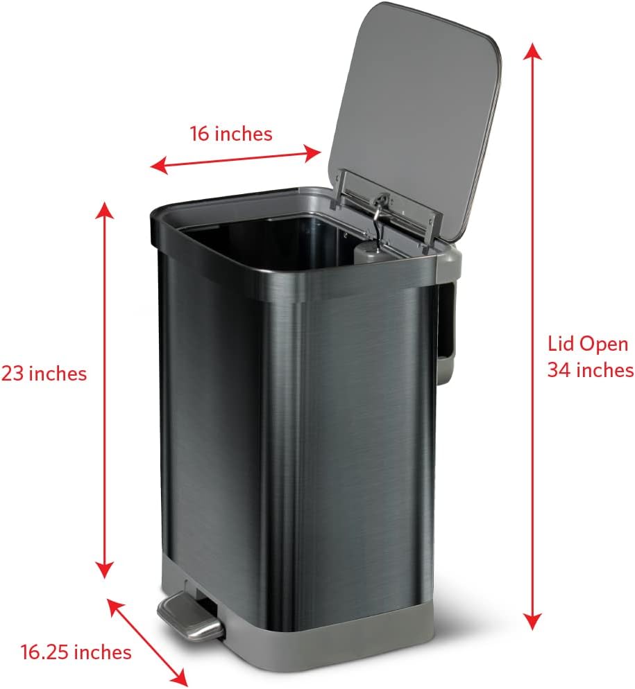 HANDS FREE STEP TRASH CAN WITH SOFT CLOSE LID – For hands-free use, this kitchen trash can is built with an easy step foot pedal. The soft-close lid is specially designed with silent operation for a quiet and controlled open and close every time.