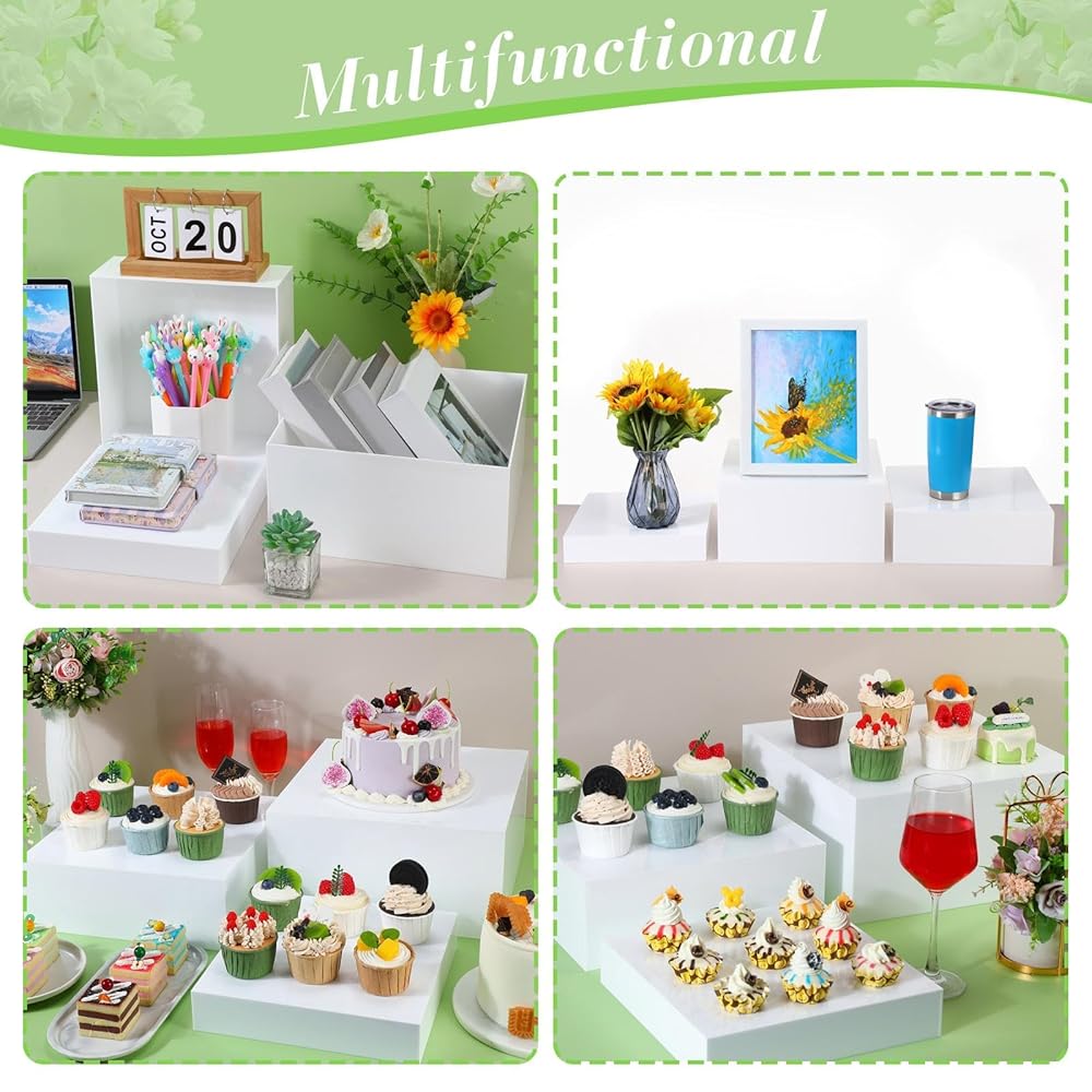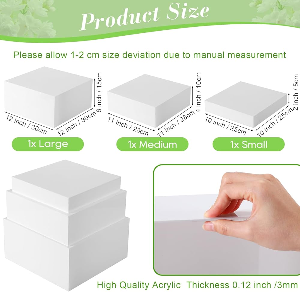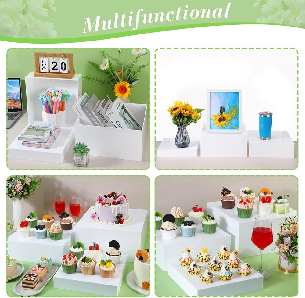 Multiple Sizes: our food risers set comes with three sizes in one set for you to use: large 12" x 12" x 6", medium 11" x 11" x 4", and small 10" x 10" x 2"; Whether you're displaying baked pastries or any buffet food, our acrylic displays are the right size for your family event or large party display needs