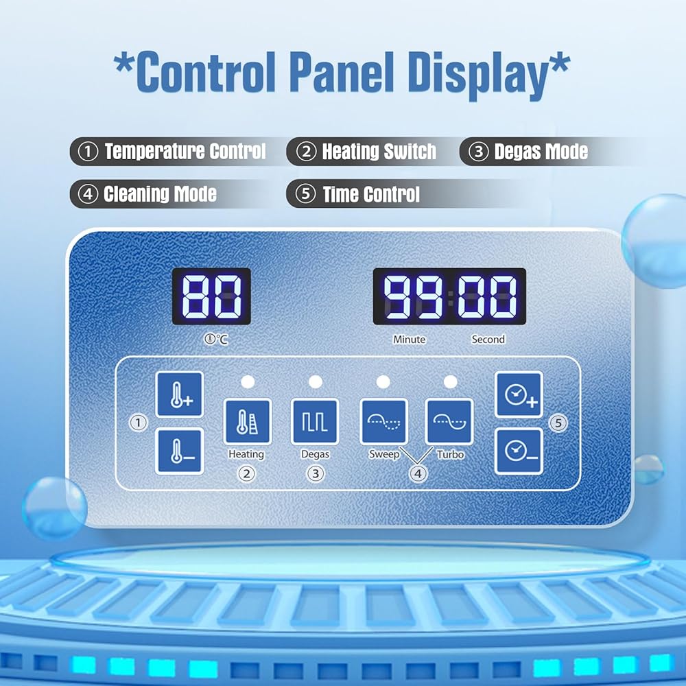 • 【سهلة الاستخدام وشاشة رقمية LED】بالمقارنة مع التحكم في المقبض الميكانيكي التقليدي، فإن منظف المجوهرات الرقمي بالموجات فوق الصوتية الاحترافي الخاص بنا سهل التشغيل بضغطة زر. تعمل لوحة التحكم بالزر على تسهيل ضبط الوقت الدقيق وإعدادات درجة الحرارة. الوقت: 0-99 دقيقة، درجة الحرارة: 0-80 درجة مئوية/176 درجة فهرنهايت. اللوحة الرقمية المزودة بوظيفة الذاكرة، سوف تتذكر آخر مؤقت تم ضبطه ودرجة الحرارة، مما يوفر وقت المستخدم.