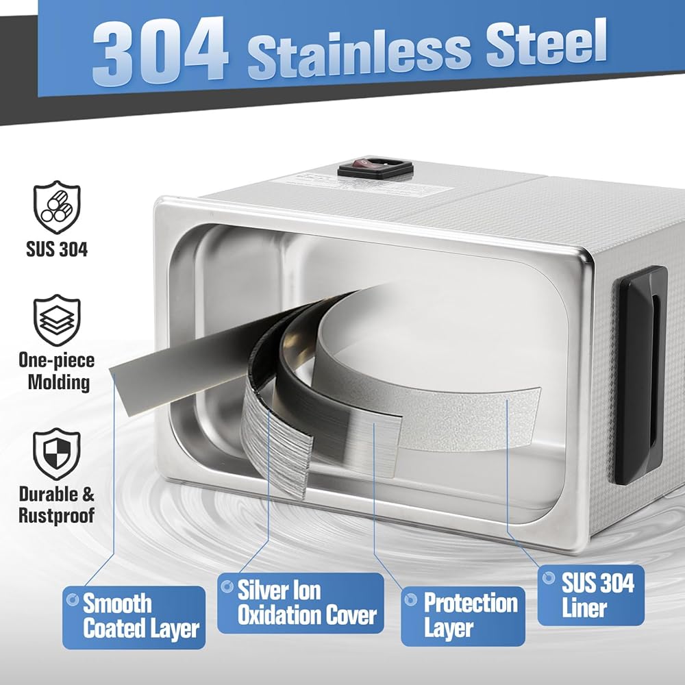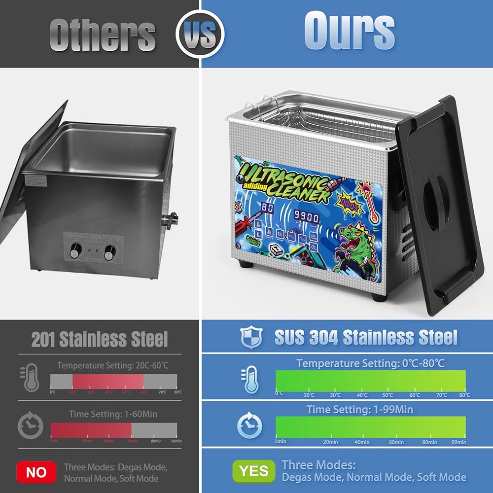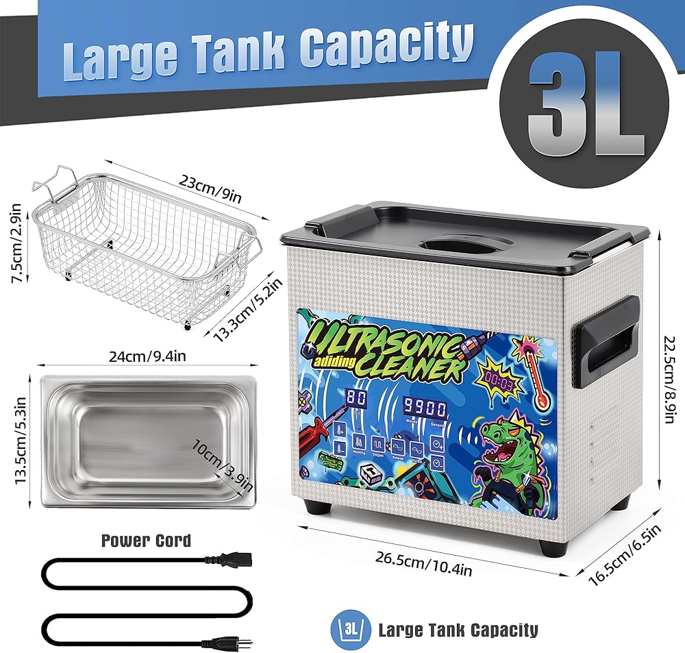 • 【تصميم متطور】منظف الأجزاء بالموجات فوق الصوتية مصنوع من الفولاذ المقاوم للصدأ 304، قوي ويمنع الصدأ. حجم الخزان 9.4*5.3*3.9 بوصة. المنظف الصوتي ثنائي الوضع مزود بسلة تنظيف من الفولاذ المقاوم للصدأ لتقليل الاحتكاك بين الجسم والخزان، مما يطيل عمر خدمة الماكينة. يضيف المنظف بالموجات فوق الصوتية المزود بملصقات نمطية سحرًا إلى سطحه، مما يجعله مثاليًا لإضفاء طابع شخصي على ورشة العمل أو طاولات العمل الخاصة بك. تم اعتماد المنظف بالموجات فوق الصوتية من قبل لجنة الاتصالات الفيدرالية (FCC) وRoHs.