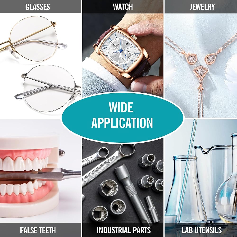 【تطبيقات واسعة】يمكن استخدام المنظفات بالموجات فوق الصوتية لتنظيف المجوهرات والنظارات والساعات وما إلى ذلك. وهي تستخدم على نطاق واسع في الجامعات والمختبرات ومتاجر المجوهرات والأبحاث العلمية وما إلى ذلك.