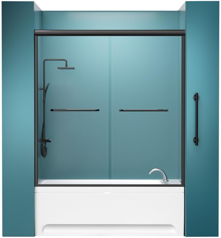 حوض الاستحمام باب دش 56-59 "W × 59" H Sliding Tub Door - 1/4 بوصة من الزجاج المقسى مع الأجهزة السوداء المصنوعة من الفولاذ المقاوم للصدأ ، حاوية الحمام القابلة للتعديل