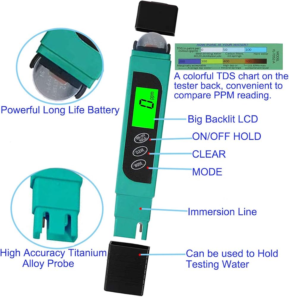 ✅【 سهل الاستخدام وسهل الاستخدام: ما عليك سوى إزالة الغطاء الواقي، اضغط على زر التشغيل/الإيقاف، ثم قم بلصق جهاز اختبار TDS في الماء (لا يزيد عن 4 سم)، في انتظار حتى تستقر الشاشة، وسيعمل جهاز قياس TDS تلقائيًا. - يتم قفله على شاشة الإضاءة الخلفية LCD في ثوانٍ، ويتم إيقاف تشغيل جهاز اختبار TDS تلقائيًا بعد دقيقتين من عدم الاستخدام للحفاظ على البطاريات. يتميز بوظيفة التثبيت التي تحفظ القياسات للقراءة والتسجيل بشكل مريح.