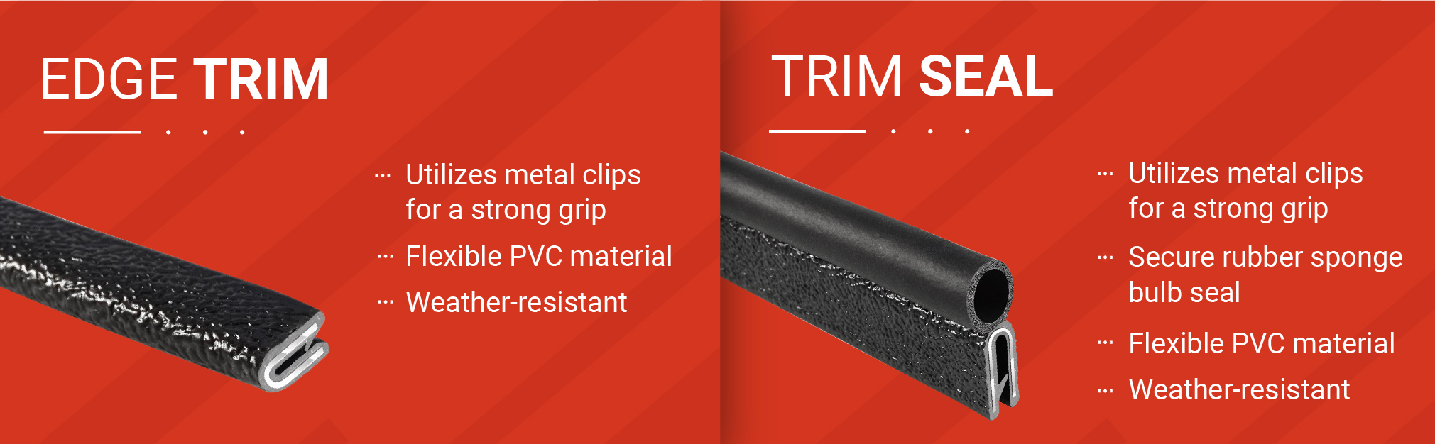 Trim-Lok's PVC Rubber-Lok simulates rubber and has individual internal metal clips to provide a secure grip. The metal clips and gripping tongue provide an excellent grip and grip retention to help you get the job done right the first time. This durable edge trim is hard with an 85A durometer level but has enough flexibility to be used on boat consoles, ATV's, helmets, utility trailers, truck bodies, automobiles, sheet metal products, and more! This black, flexible edge trim is made of a durable PVC material that allows for outdoor use. It can resist temperatures ranging from -20° to +158° while withstanding moisture and sunlight so you can confidently install it exactly where needed. Dependability is a guarantee with Trim-Lok. This plastic edge protector trim comes in a variety of colors, materials, lengths, and edge thicknesses, allowing for a professional trim with a textured black finish to be applied to a multitude of applications. Trim-Lok has been a family run business for over 50 years. Made in the USA, we believe that craftsmanship is never something that requires compromise. Our extensive line of edge trim, trim-seal, rubber seal, locking gaskets, snap-in seals, plastic profile, foam hand grips and tubing and so much more provide you with solutions for a variety of marine, automobile, RV and home applications.