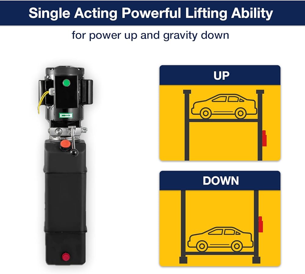 【تفاصيل المنتج】- تم تصميم المضخة الهيدروليكية أحادية الفعل بقوة 3 حصان بمحرك تيار متردد 2.2 كيلو وات 220 فولت وخزان 3.7 جالون لرفع السيارة. أقصى ضغط تخفيف هو 2950PSI. السلطة لأعلى والجاذبية لأسفل.