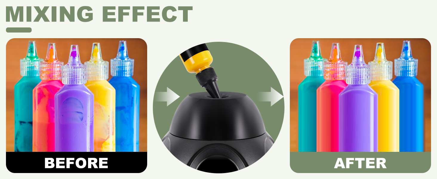 【تشغيل سهل】 تصميم الزناد الذي يعمل باللمس، أمسك الزجاجة ثم اضغط لأسفل. لا مزيد من اهتزاز زجاجات الطلاء باليد، ستدور السوائل تلقائيًا في دوامة وتجلب حياة جديدة.