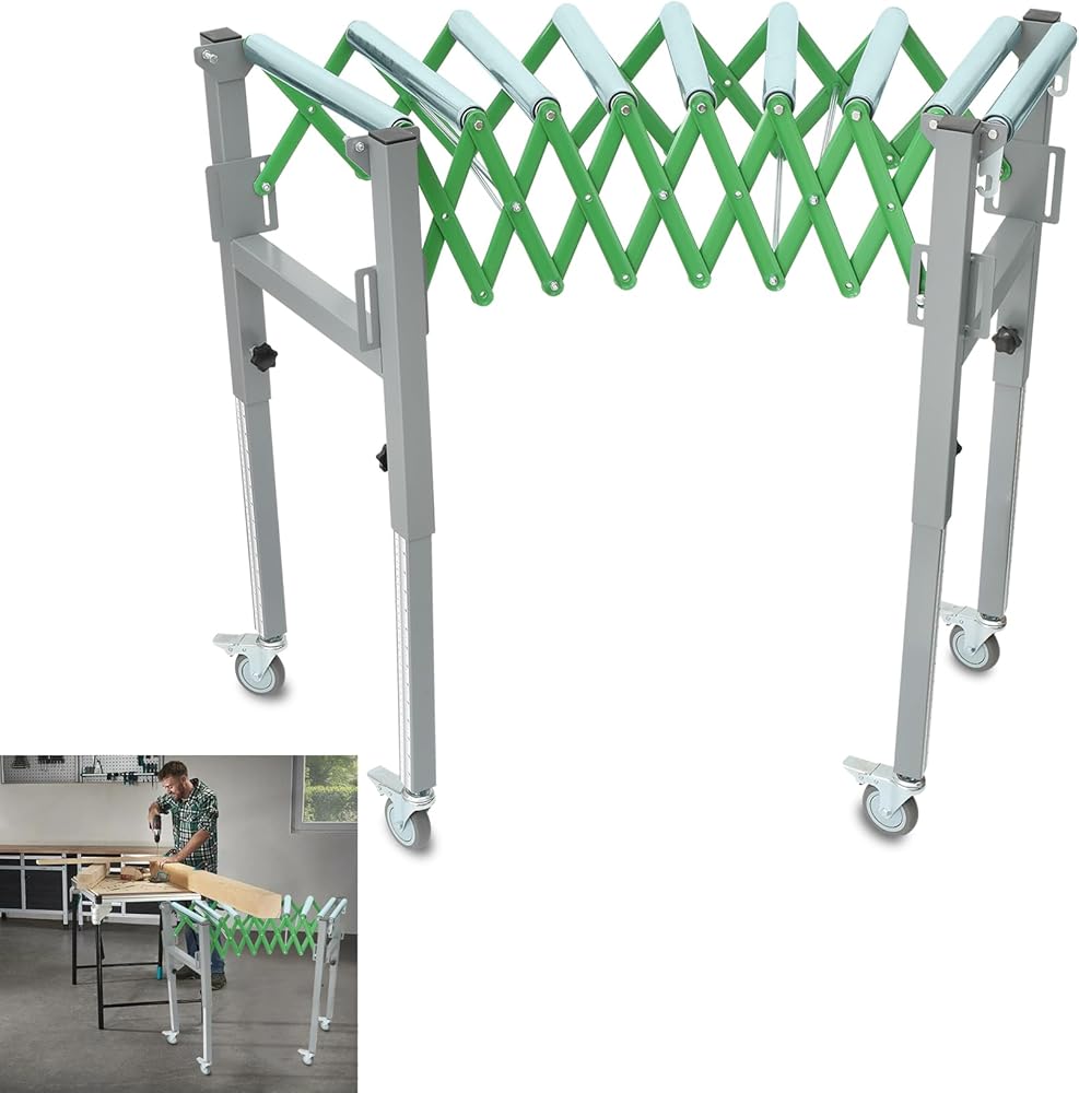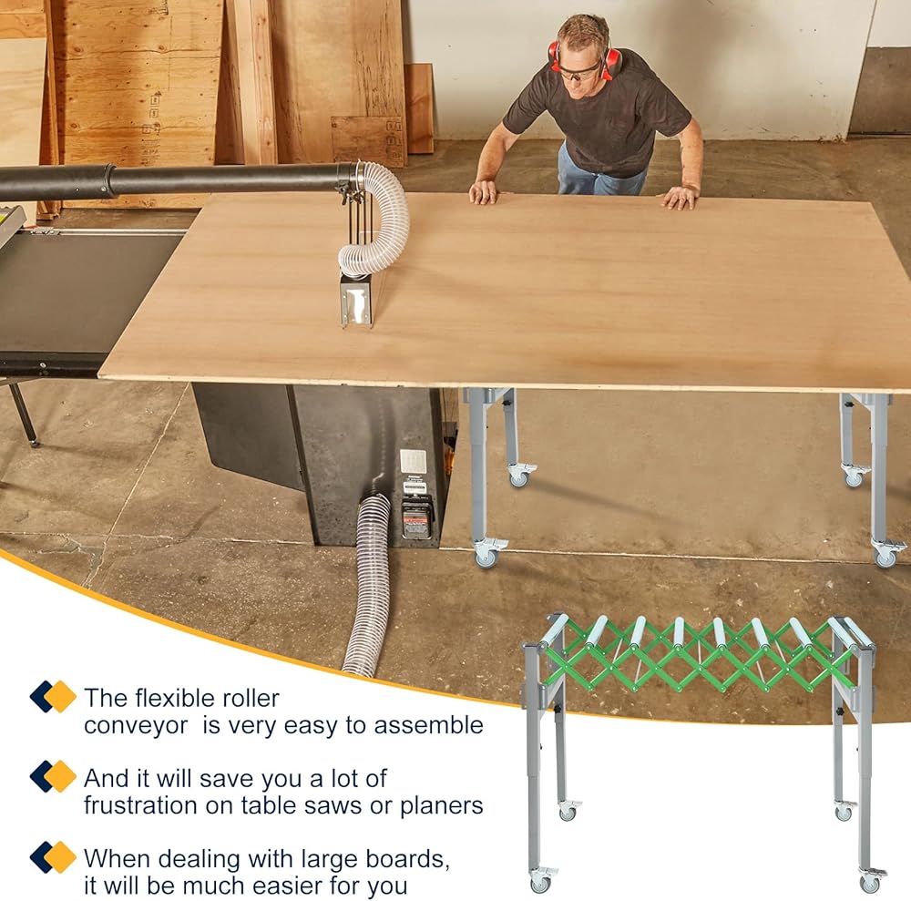 【Multi functional conveyor system】The portable conveyor roller can adjust the height according to the needs of the table saw or planer moulder, and has the characteristics of stretchability and turning, making it easy to use. At the same time, the support legs are made of high carbon steel stamped galvanized material, with strong bearing capacity