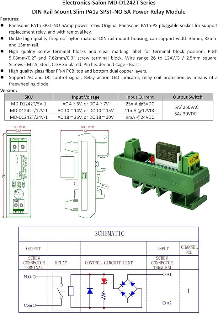 - Support AC and DC control signal, Relay action LED indicator, relay coil protection by means of a freewheeling diode.