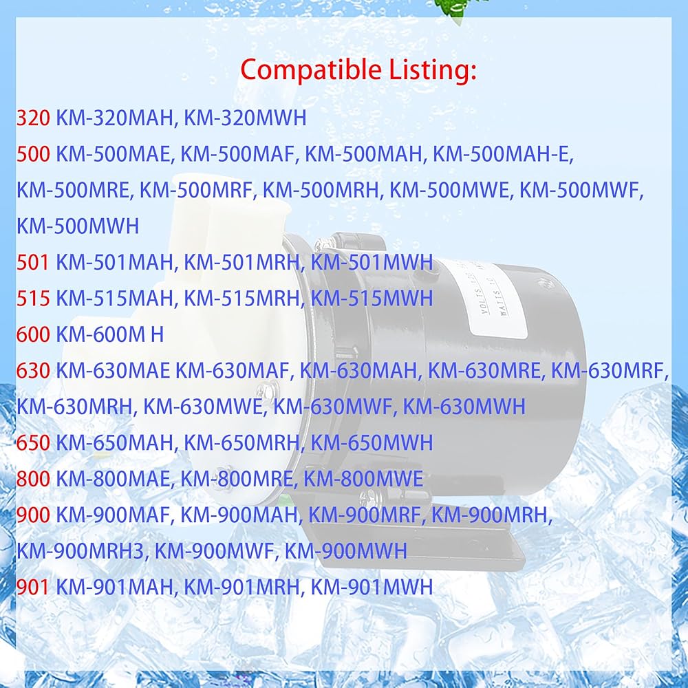 Ice machine water pump motor is compatible with Hoshizaki models KM-450 THRU KM-900, even numbers only (900-SD, B-500PF, B-700PF, KM-900MAH,KM-900MRH, KM500MAH, KM630MAH, KM900MAH, KML-600MAH, URC-12F).