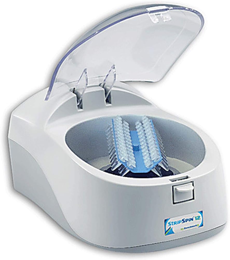The Strip Spin 12 Mini Centrifuge from Benchmark is the only mini centrifuge designed for centrifugation of 12 position PCR strips. With a fixed speed that produces 2, 000 xg, this centrifuge is perfect for quick spin downs. Simply close the lid and the unit quickly ramps up to 5, 500 rpm. Open the lid, and the rotor quickly decelerates for easy removal of samples.