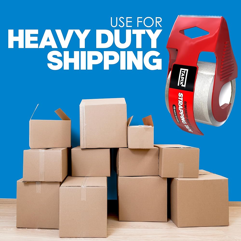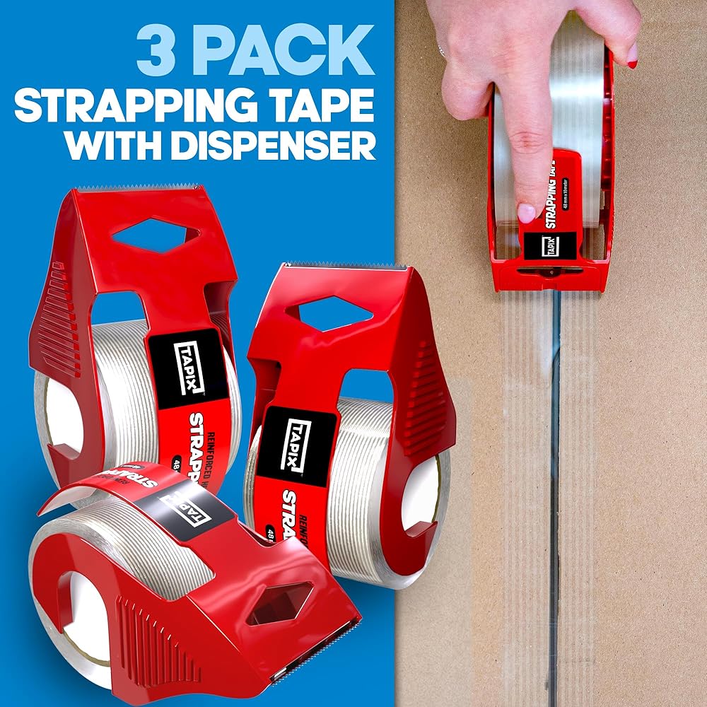 شريط ربط مع موزع 1.88 بوصة × 380 بوصة، (3 عبوات) شريط من الألياف الزجاجية قوي للغاية ومقاوم للتمزق، شريط شفاف يحمل ما يصل إلى 120 رطل