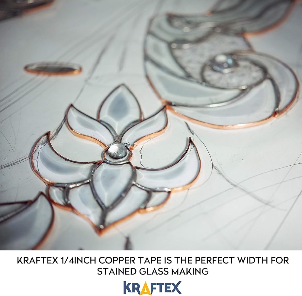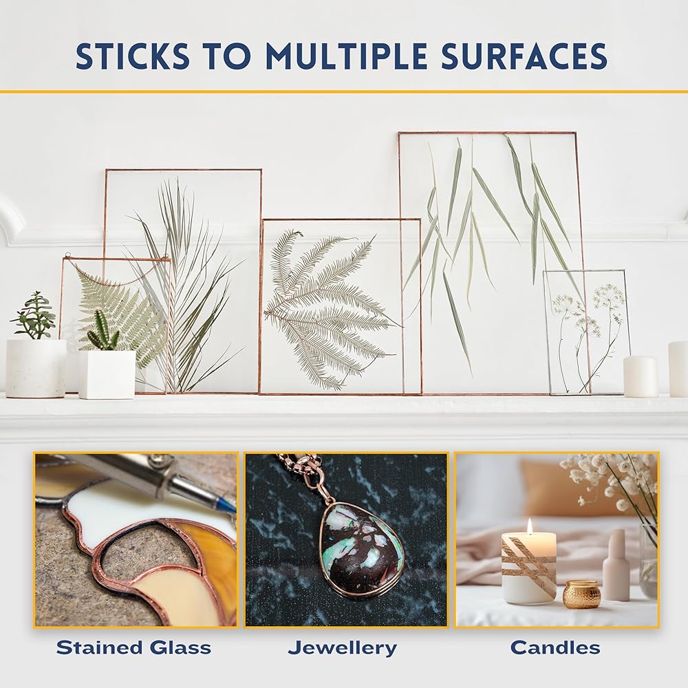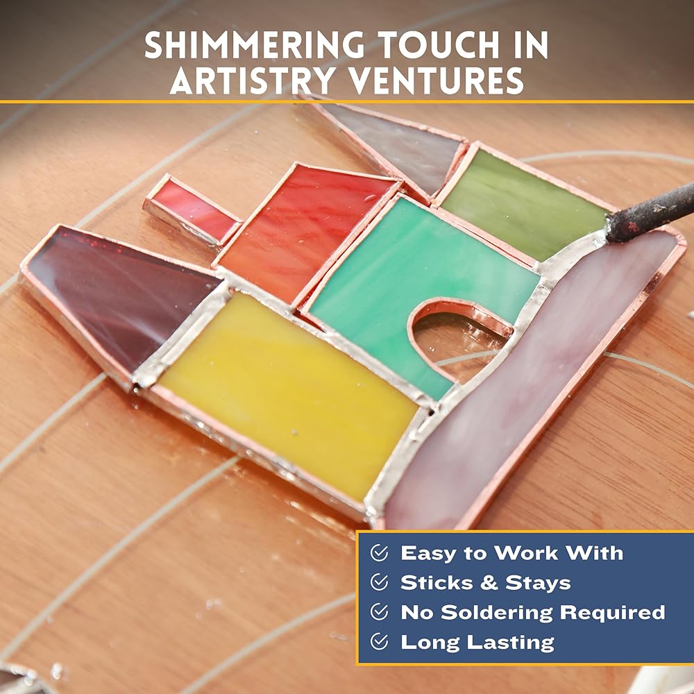 إطار من الزجاج الملون: لا يلتصق اللحام بالزجاج لذا استخدم شريط رقائق النحاس الخاص بنا للزجاج الملون، فهو الشريط النحاسي المثالي لحام تلك الحواف والأسطح للحصول على مظهر جيد وعملي.